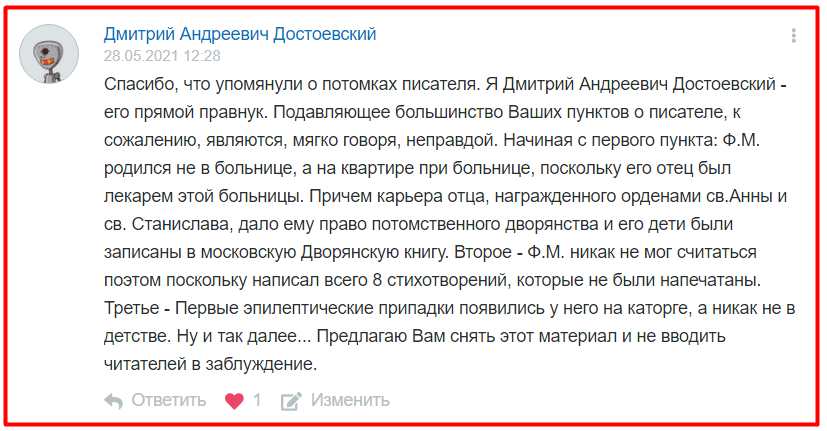 Я сначала подумал, что это «тролль». Ведь нетрудно представиться кем угодно. Однако ради интереса я загуглил электронную почту, которую пользователь указал при отправке комментария. И она действительно принадлежит Дмитрию Достоевскому