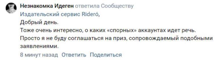 Как вы видите на скриншоте, Rideró предъявили за якобы «спорные аккаунты, кажется созданные именно для участия в конкурсах». Плюс, они утверждают, что у моего рассказа «немного больше голосов и от реальных аккаунтов».