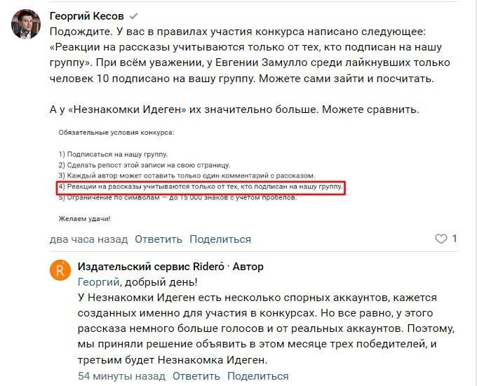 Мой друг Георгий Кесов, который приложил руку к моему рассказу (редактировал его), был справедливо возмущен. И он написал об этом комментарий к посту с результатами: