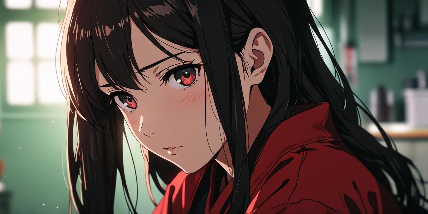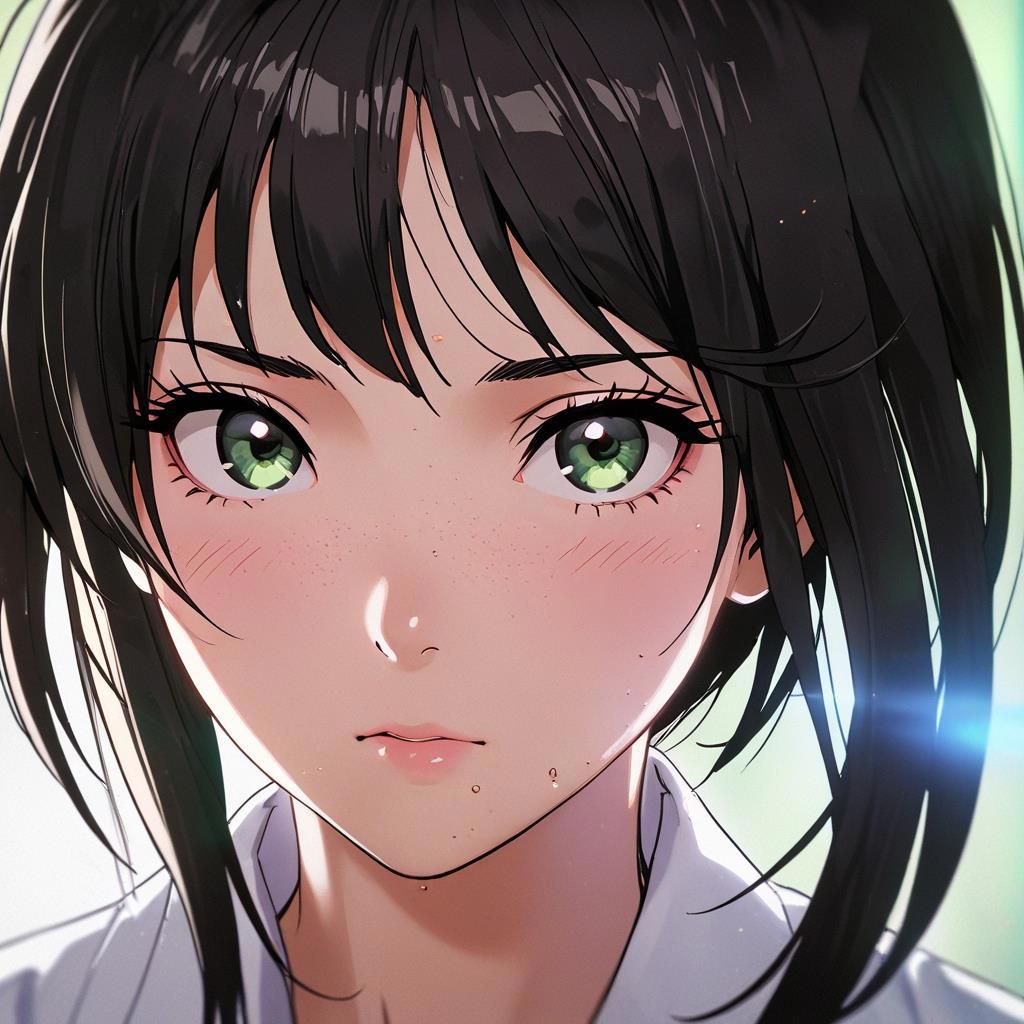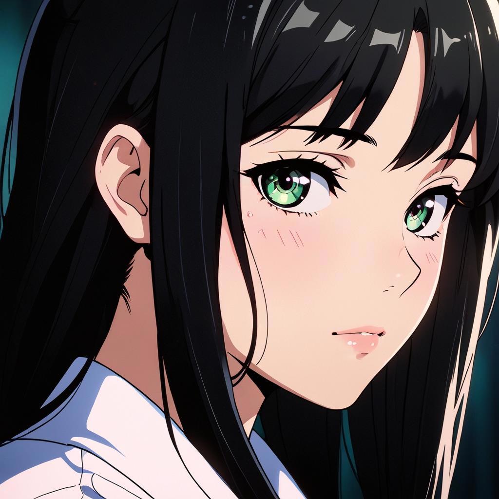 Зеленые глаза, маленький носик, небольшая морщинка на лбу, черные волосы.