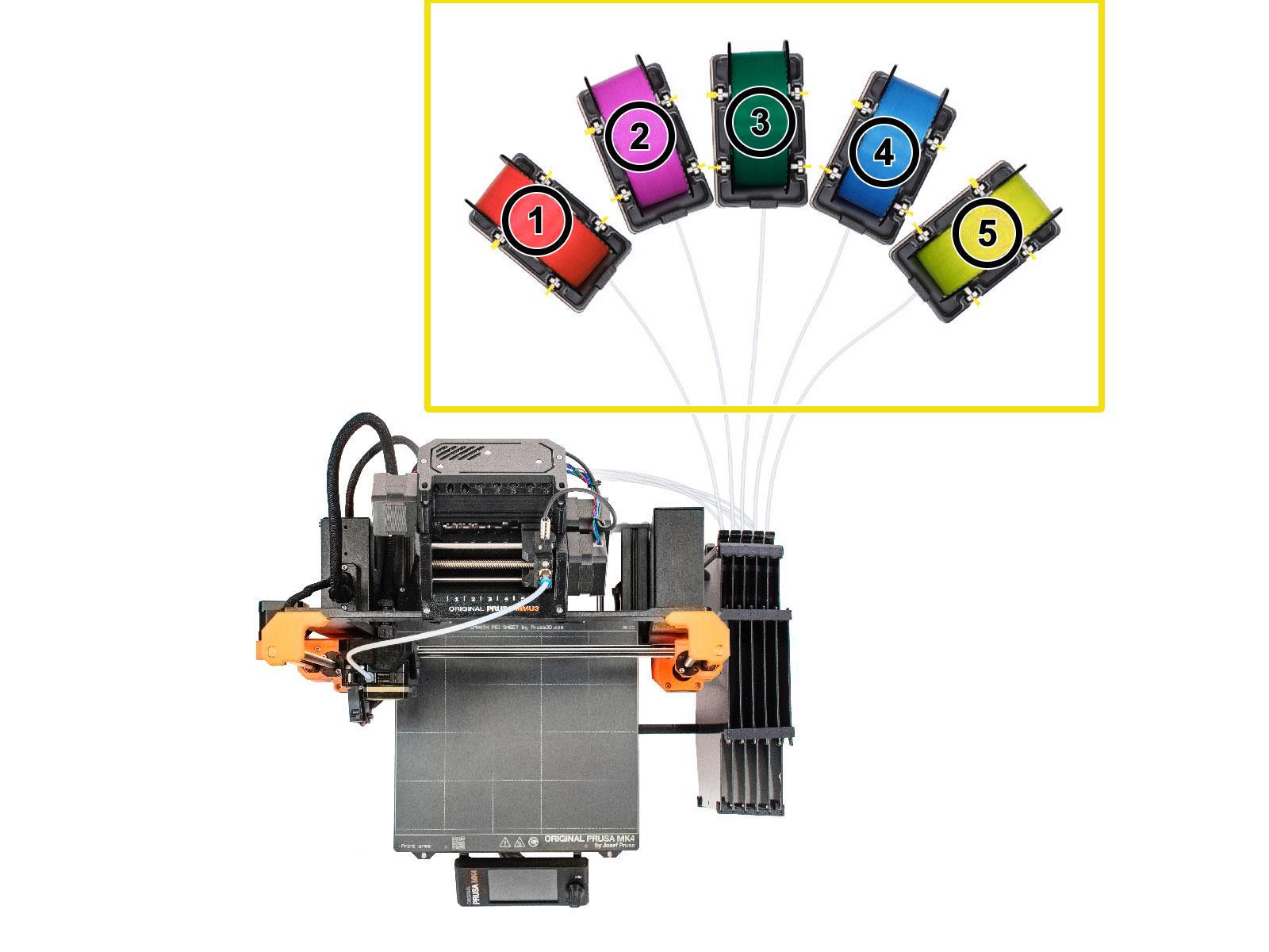 Original Prusa MMU3 (Multi Material Upgrade) обеспечивает печать пятью цветами. Само устройство сравнительно небольшое и крепится к верхней перекладине принтера. (Если принтер стоит в шкафчике, то там для этого достаточно места.)