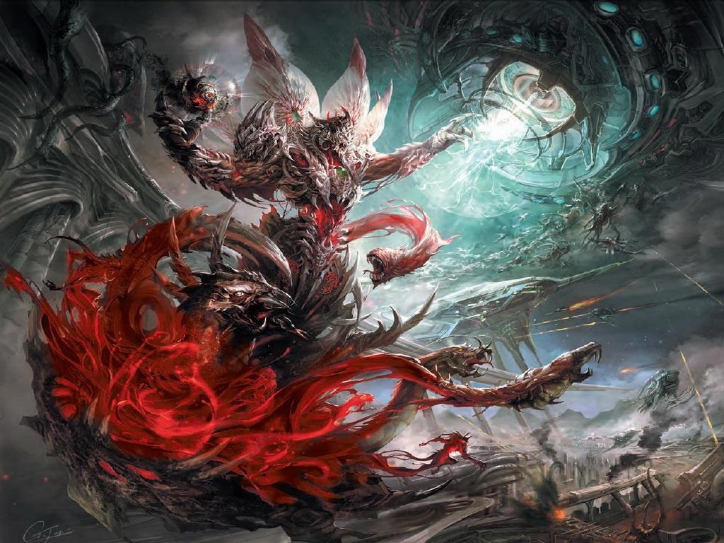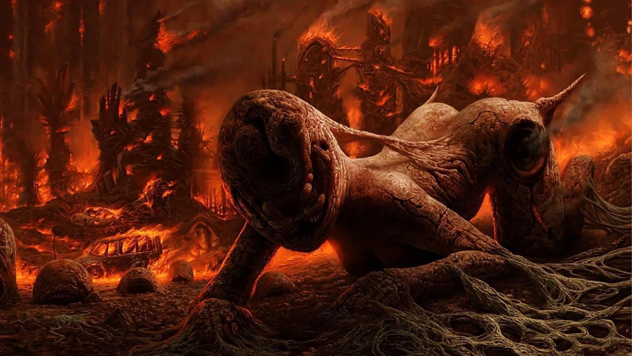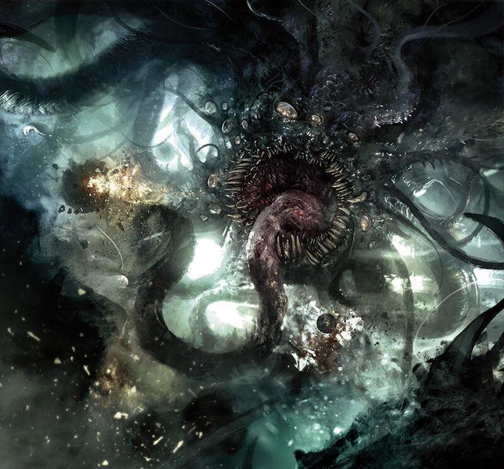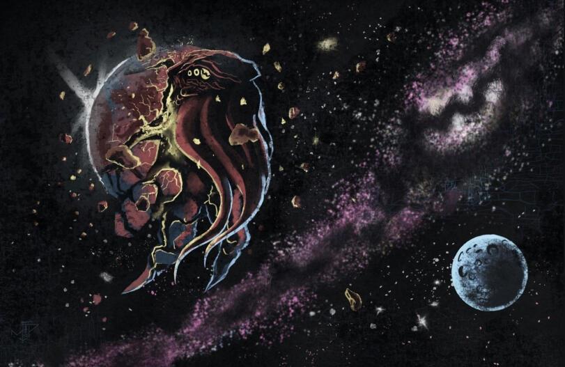 Из Земли «вылупилась» тварь неимоверных размеров. Чёрная, с множеством щупалец, глаз и пастей. Десятки извивающихся конечностей обхватили Луну.