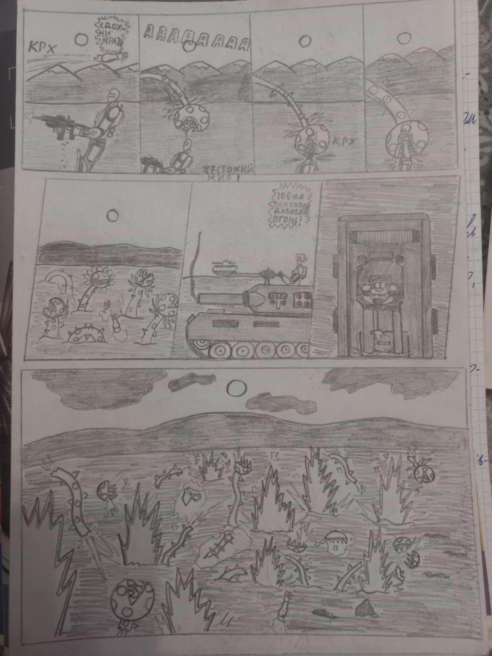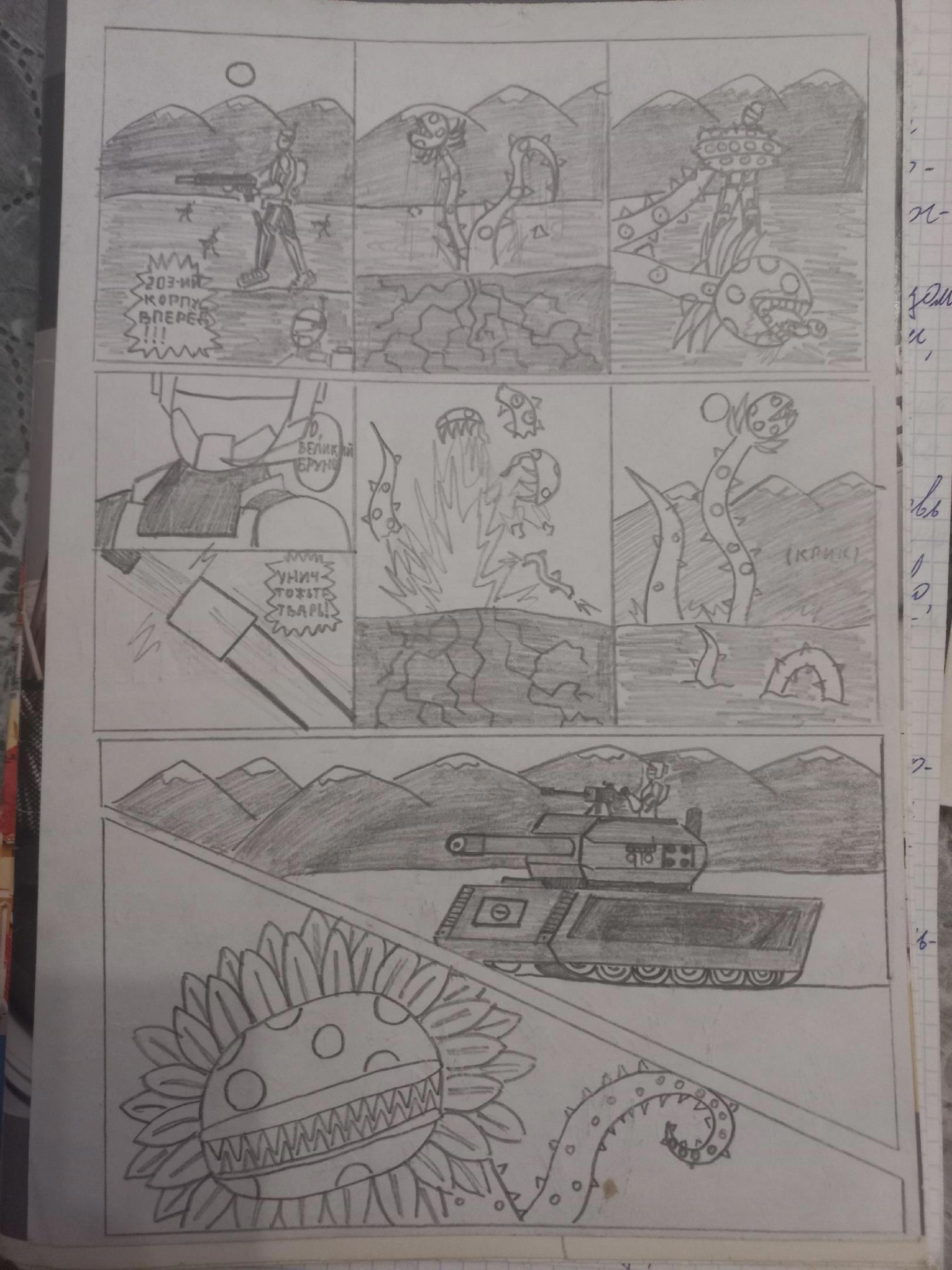 А вот тут уже начинается экшон, где на перых 4 фреймах сжирают солдата. (Вiчна пам'ять). Дальше, с нескольких ракурсов показывают танчик, после чего, видно, как расстреливают целую кучу сраных мухоловок из Марио. Надеюсь, более-менее, вам понятно нарисованное.
