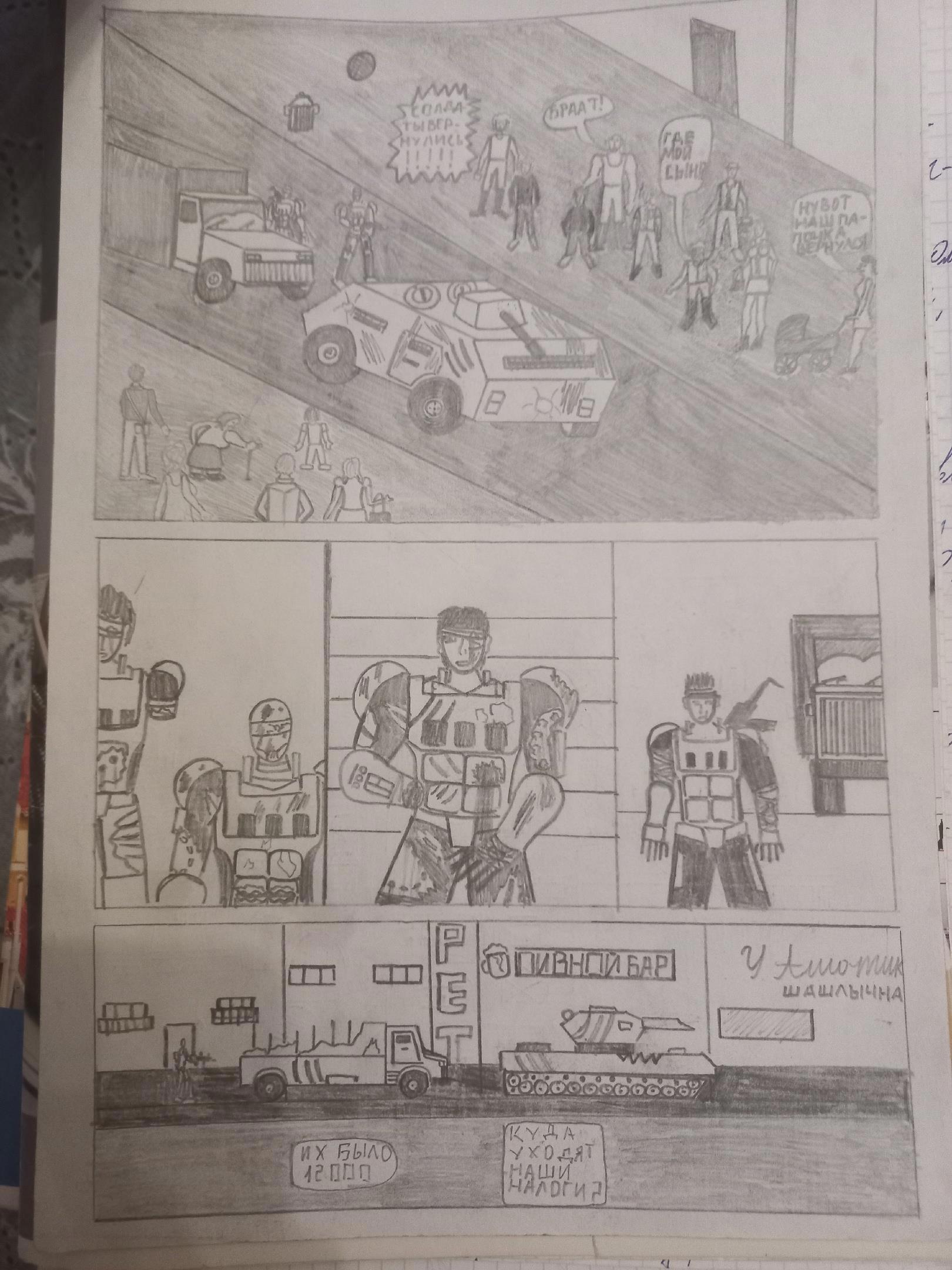 Вообще, почему эти страницы чёрно-белые? Ну, от фломастеров бумага буквально намокала и они размазывались в процессе рисования. Плюсом, к тому моменту, я уже начал читать японскую мангу и мне показалось крутым рисовать также, в чёрно-белых тонах.