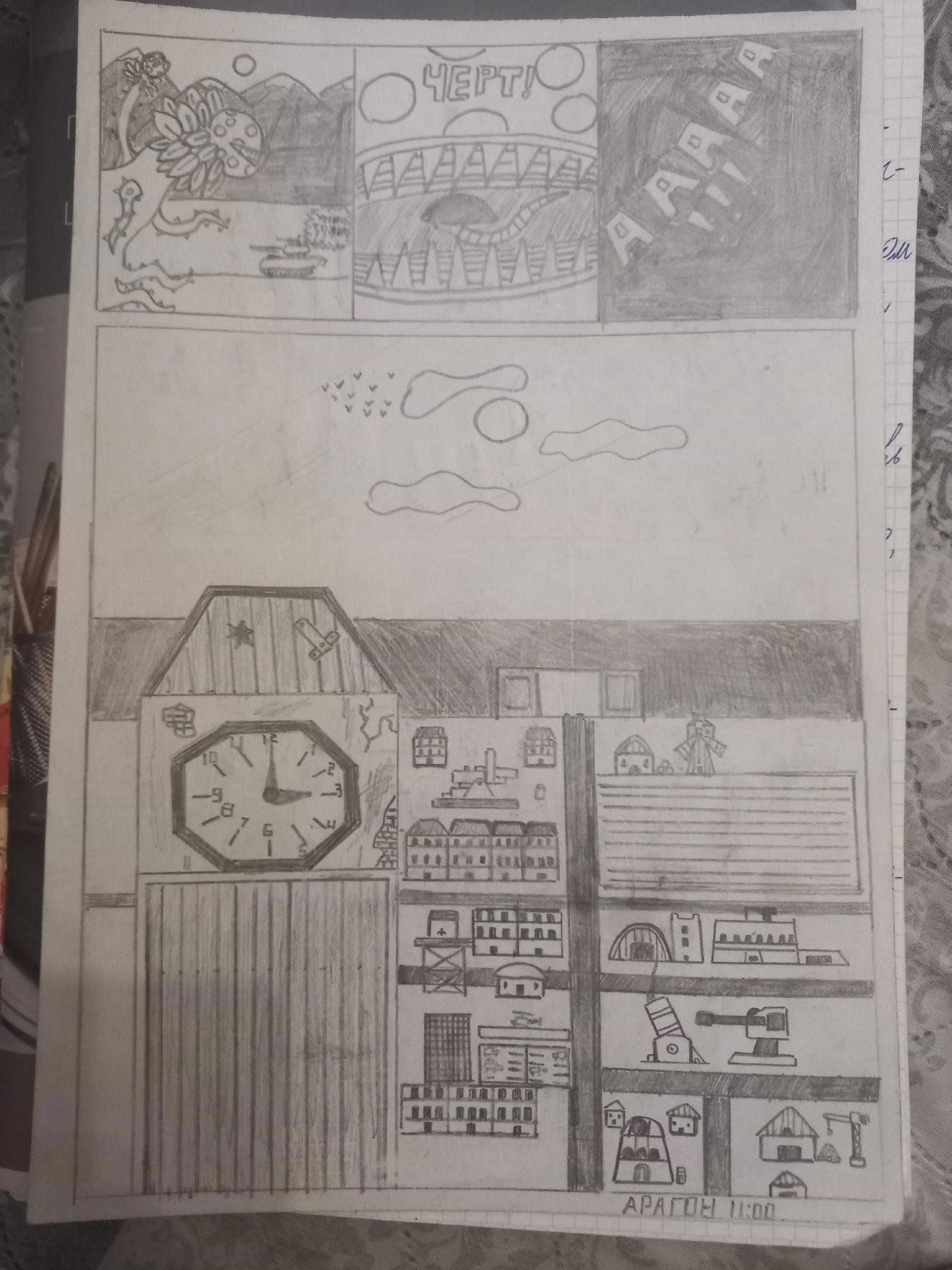 Я хотел поискать в своих старых идеях какое-то вдохновение, но... ничего не нашёл, прикиньте? Формат комикса я не совсем хорошо понимал. Все истории были нарисованы на А4 по горизонтали. И все фреймы были одинакового размера, и вообще нарисованы карандашами, под линейку. Их ничто не разделяло.