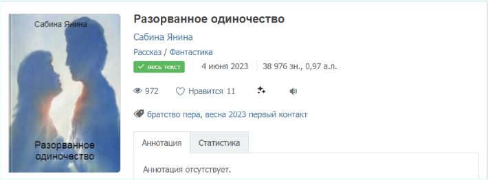 Автор: Лана ЗассВчера прочитала рассказ Сабины Яниной «Разорванное одиночество». Это просто отзыв.