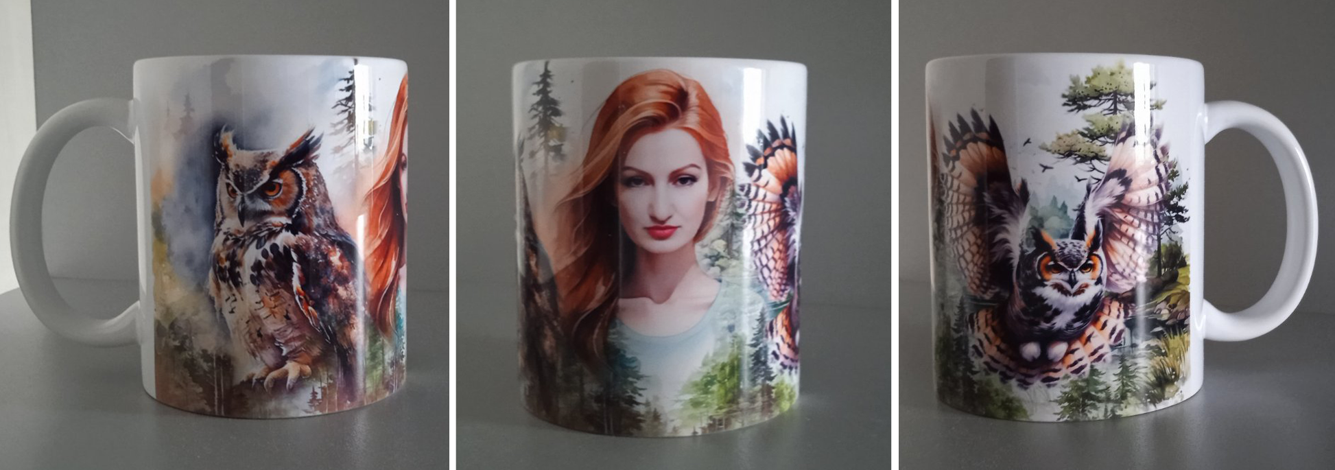 На портрете моя коллега – Лариса. Птичка – филин. Филин птичка невероятно умная сильная и упорная, вполне может напасть на лису и отнять добычу у охотника. Ну и конечно же это ночная птица. Рефы птички из интернета, портрет с натуры, сосны и ёлки по памяти, акварель. Эскизы отсканированы, доработаны в фотошопе и отданы в печать. Кружечек в планах будет еще много. Сов я люблю, мир ночных птичек очень разнообразен, мир ночных людей разнообразен не меньше.
