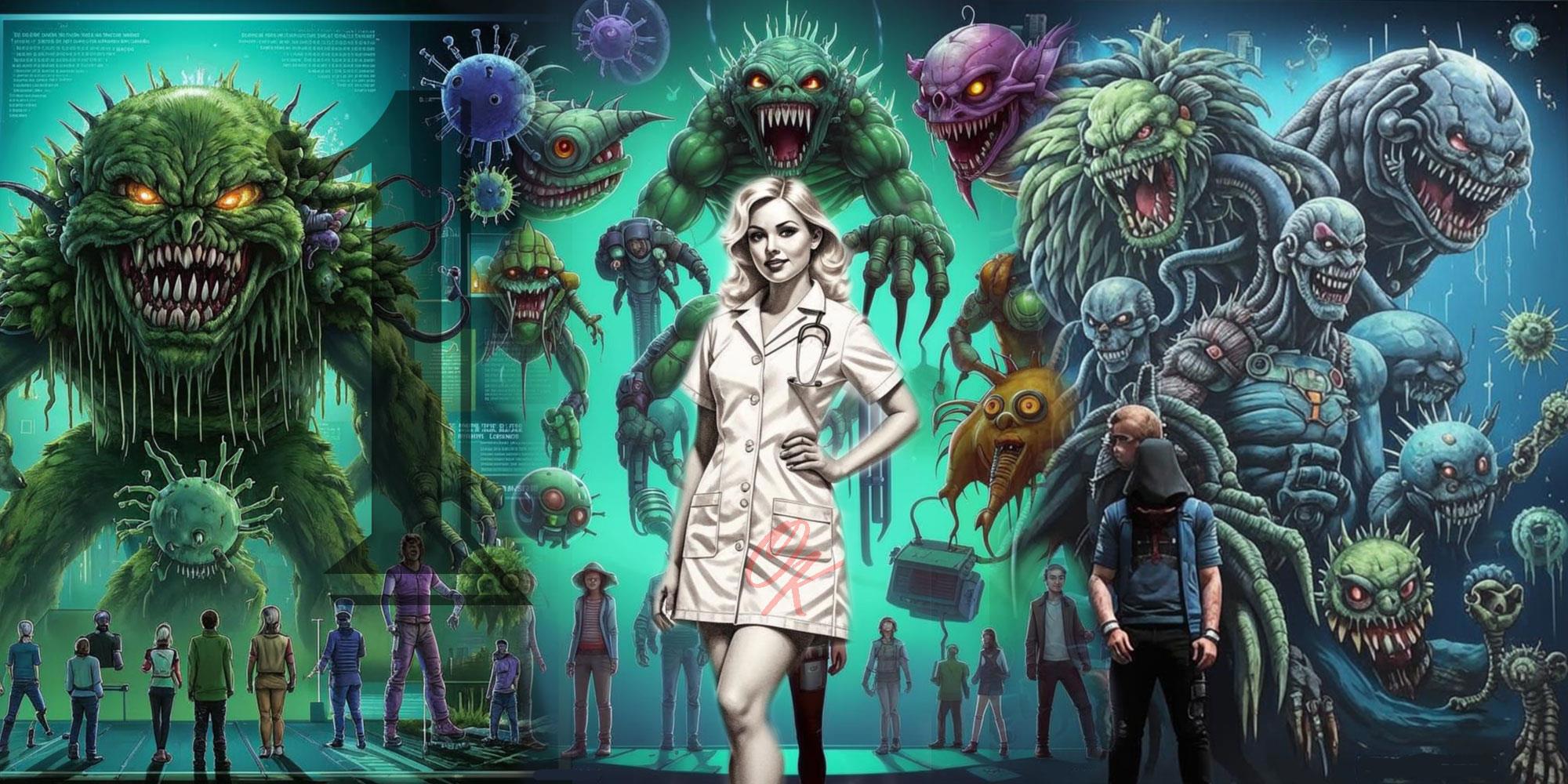 - Так выглядят зловредные вирусы и микробы в многократном увеличении, - пояснил бывший ученик художественно школы, - при встречах остерегайтесь, опасайтесь и избегайте контакта. Не забывайте, что они везде и всюду в огромных количествах. На перилах лестничных пролетов. На ладонях ваших рук. А также в воздухе, которым вы дышите. В воде, которую пьете. В пище, которую едите. А под ногтями ваших рук целый зоопарк вирусов, включая самые страшные и опасные для здоровья и жизни.
