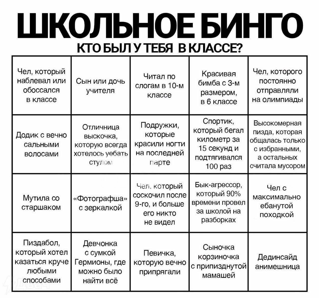 В связи с этим предлагаю сыграть в «Школьное Бинго». Качайте (или скриншотьте) табличку, отвечайте галочками поля, и скидывайте в комменты. Будет интересно посмотреть на результаты