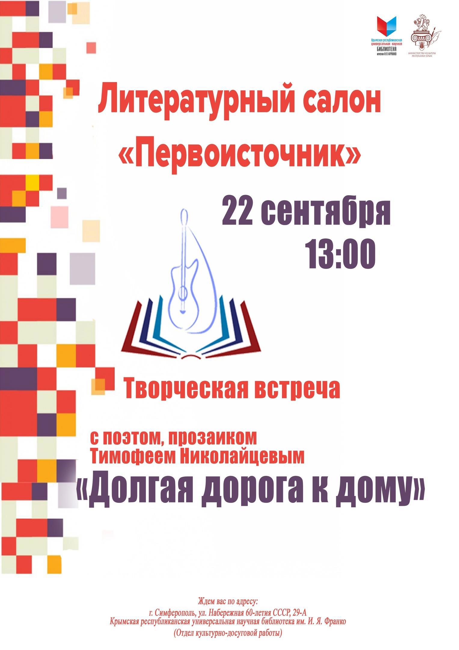 Автор: Тимофей НиколайцевДрузья, приглашаю всех-всех на мою первую полноценную творческую встречу в центральной библиотеке Симферополя.