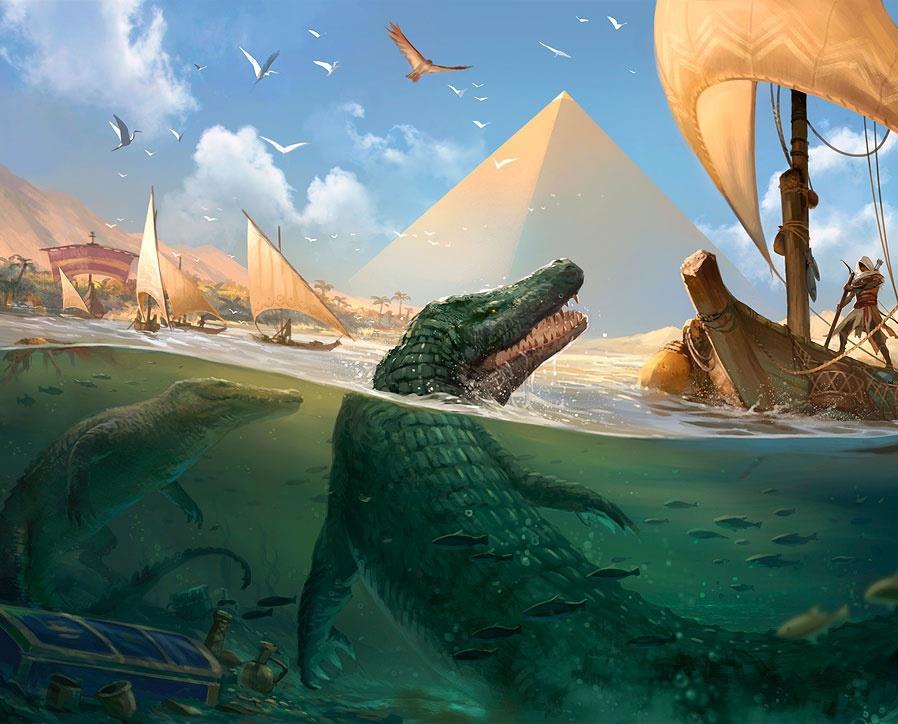 Под изумлённым взглядом Понеба то тут, то там на поверхности стали появляться крокодилы. Рядом с нами, чем-то похрустывая, всплыла морда в знакомых шрамах. Мужчина отшатнулся от борта, явно непристойно выражаясь на незнакомом мне языке. А река в отблесках факелов ещё больше вспенивалась телами рептилий, что устроили себе «пирушку».