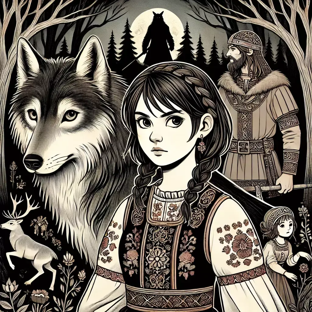 "На переднем плане изображена девушка с короткими тёмными волосами, заплетёнными в две косички. Она одета в традиционное славянское платье с вышивкой. Её лицо выражает решимость и смелость. Рядом с ней волк. Они стоят на фоне древнего славянского леса, где среди деревьев виднеются магические существа — лесовики, русалки и домовые. На заднем плане виден тёмный силуэт мужчины в доспехе с оленьими рогами на шлеме."