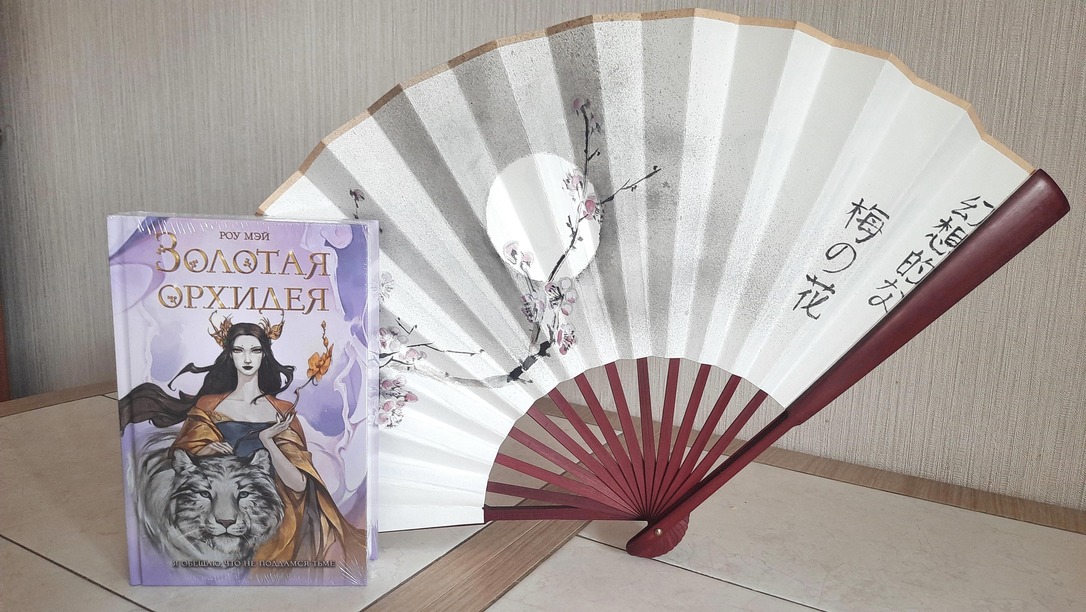 Помимо того, что "Золотая орхидея" уже в магазинах, у меня ещё одна радость: супруг подарил тематический веер! Надпись на этой стороне "дивные цветы сливы". Кто догадается, что написано на другой?