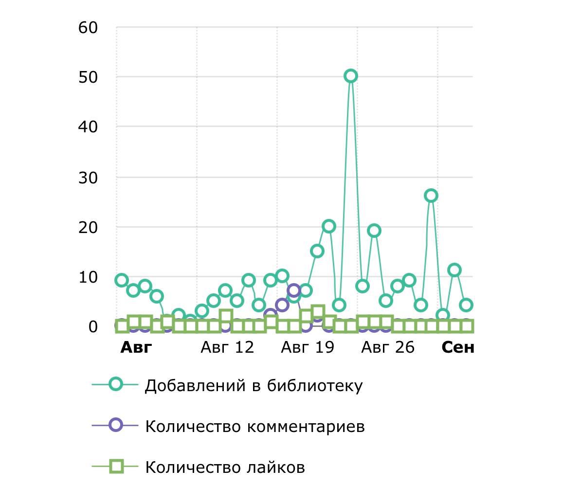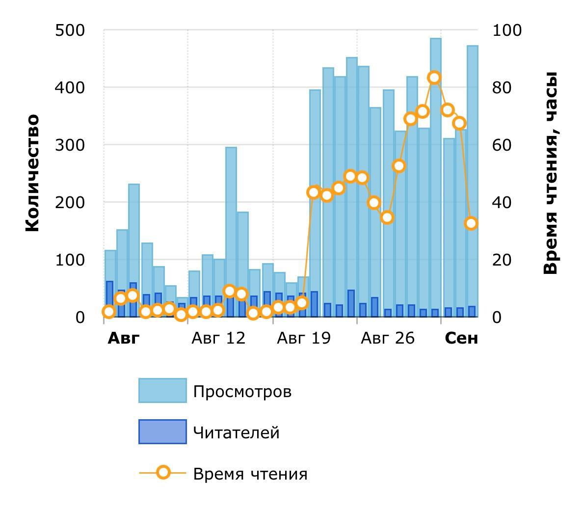 Максимальными показателями за весь период оказались 485 просмотров 1 сентября (сегодняшний день я не считаю, ведь он еще не прошел, но т к там уже 479 просмотров, думаю от побьет рекорд 1 сентября). По часам чтения максимальным значением оказалось 83 часа, тоже 1 сентября.