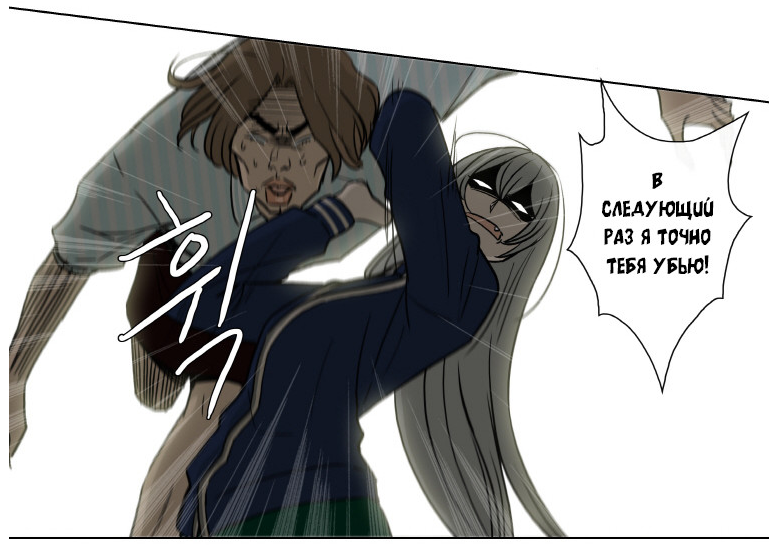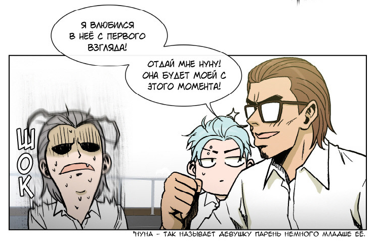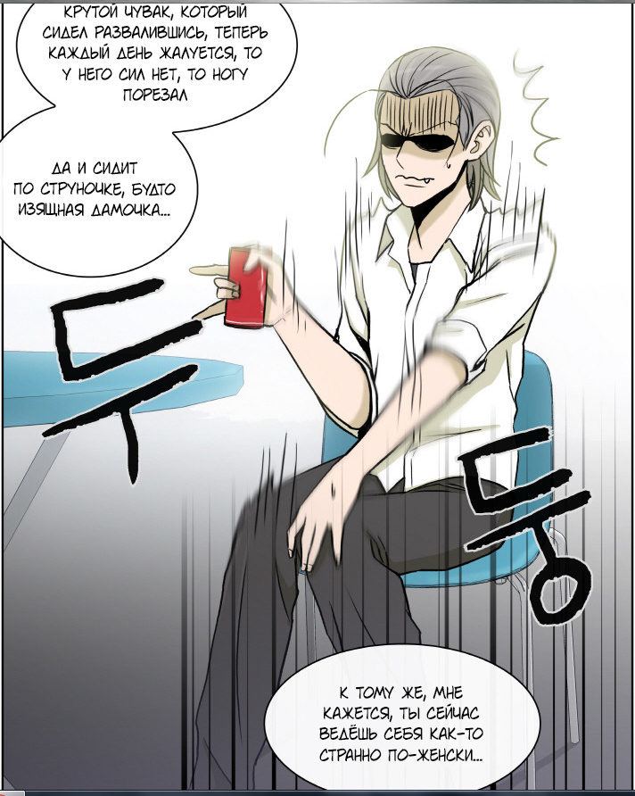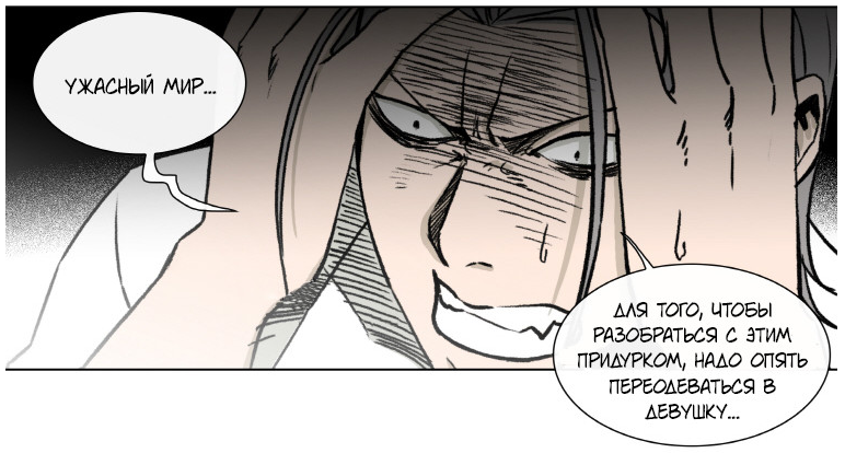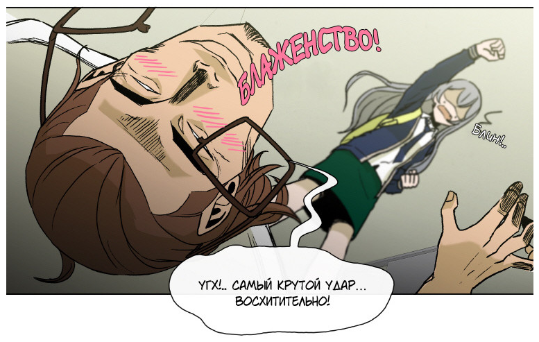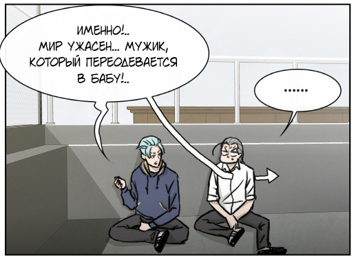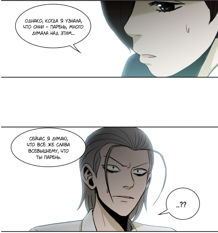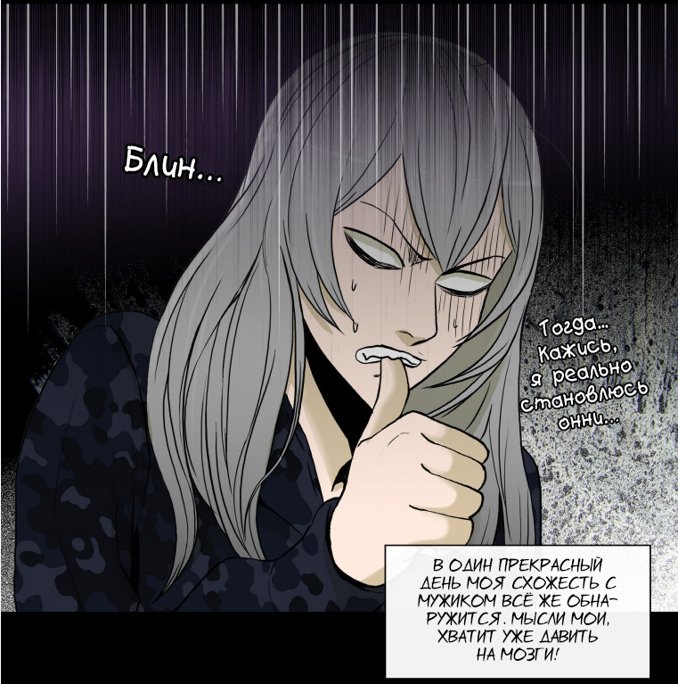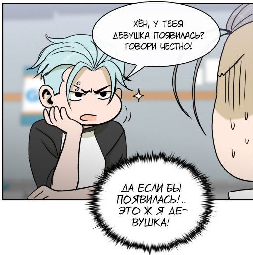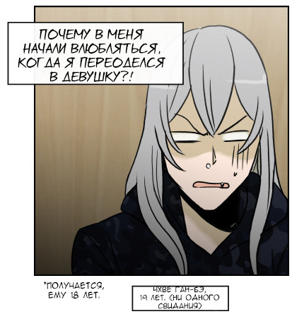И даже тут автор-художник манги (или манхвы?) умудрился вставить весьма годный юмор, ибо героя спасают... силиконовые вкладки, коих он безмерно напихал в бюстгальтер. Тема сисек раскрыта! Причём без малейшего оттенка пошлости или связи с сексом))) Но героя всё-таки чуток достали ножом и при перевязке у знакомого визажиста (не гея!) который и научил Чхве Ганбэ красится, их "застукивает" сестра визажиста. И автор нам даёт две картинки: то, что видит сестра...