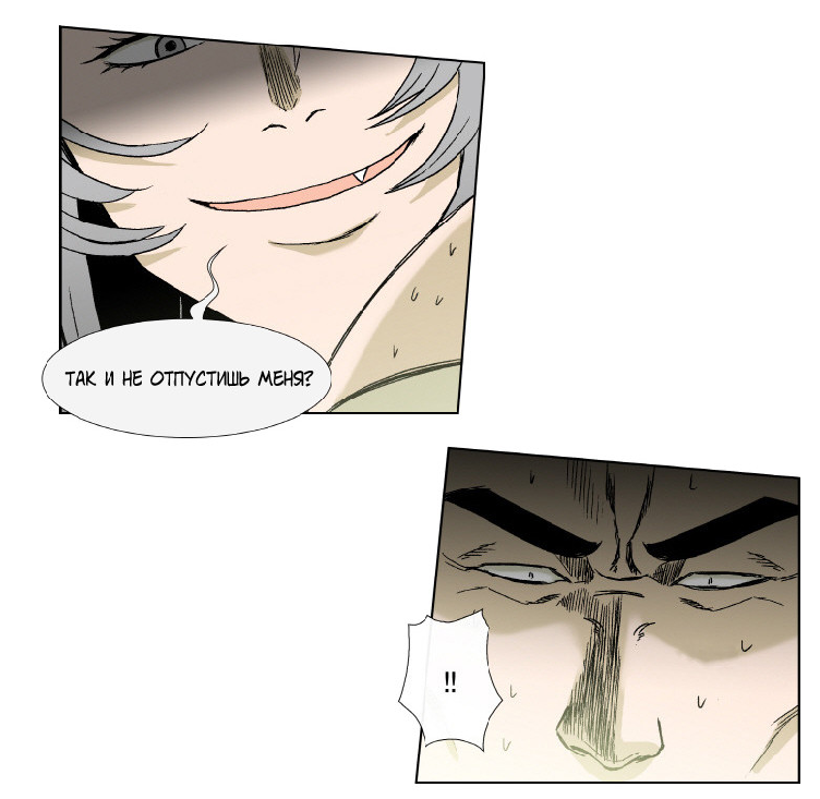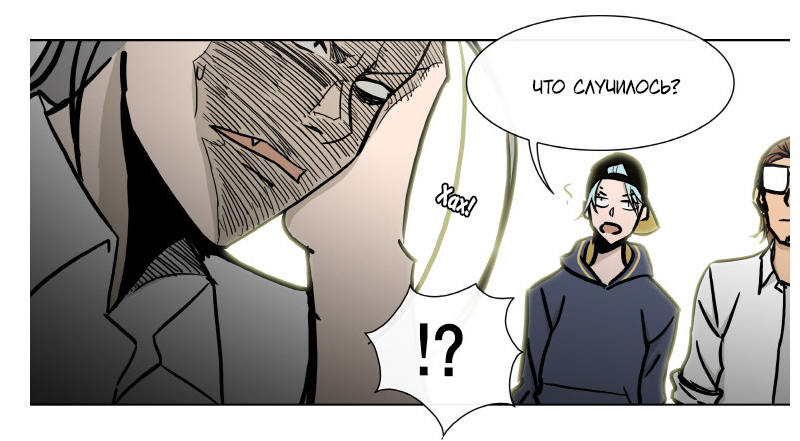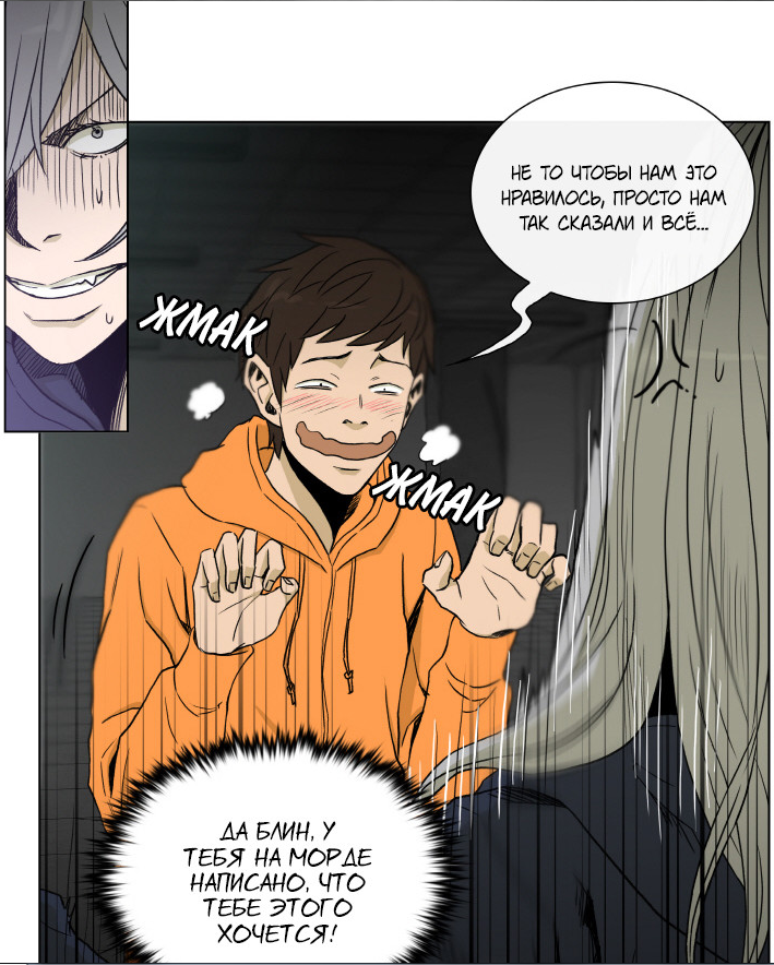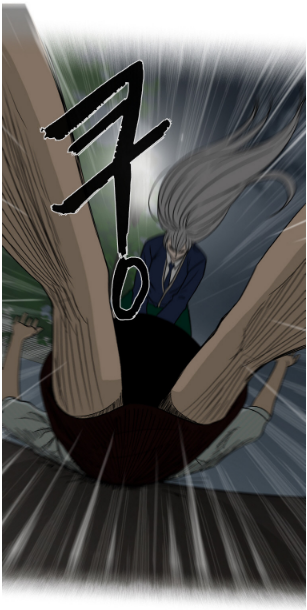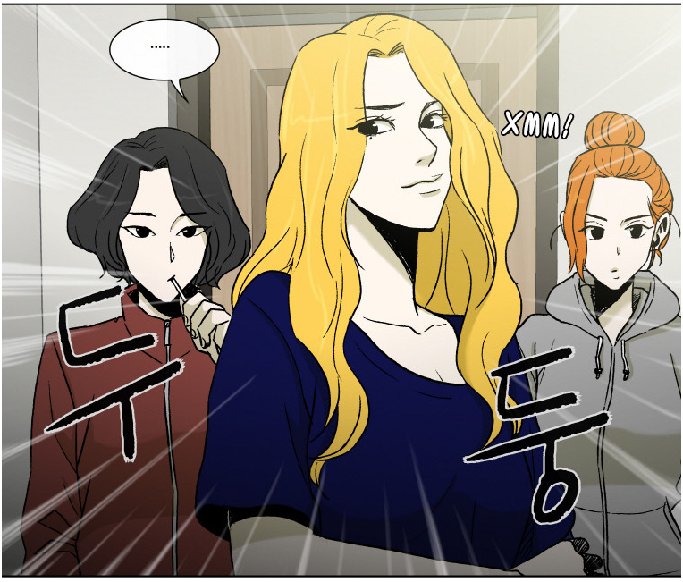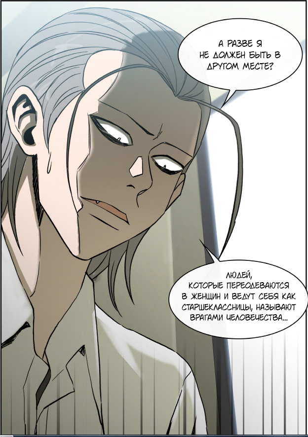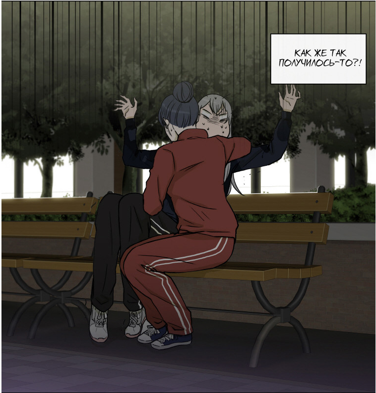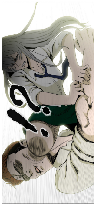 И даже тут автор-художник манги (или манхвы?) умудрился вставить весьма годный юмор, ибо героя спасают... силиконовые вкладки, коих он безмерно напихал в бюстгальтер. Тема сисек раскрыта! Причём без малейшего оттенка пошлости или связи с сексом))) Но героя всё-таки чуток достали ножом и при перевязке у знакомого визажиста (не гея!) который и научил Чхве Ганбэ красится, их "застукивает" сестра визажиста. И автор нам даёт две картинки: то, что видит сестра...