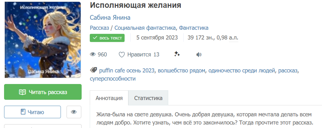 Автор: Лана ЗассПрочитала рассказ Сабины Яниной «Исполняющая желания».