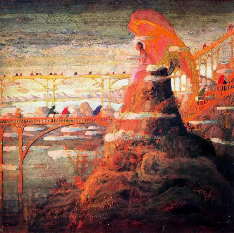 В 1908-м, не найдя понимания своего искусства на родине, Чюрлёнис приезжает в Петербург. Он знакомится с М. Добужинским, который представил Чюрлёниса Союзу русских художников. Чюрлёнис сближается с кругом «Мира искусства», участвует в организуемых ими выставках. Его картины вызывают восхищение А. Скрябина. Интерес был взаимным. Романтическая символика Чюрлениса, космический культ стихий - моря, солнца, мотивы восхождения к сияющим вершинам за парящей птицей Счастья - все это перекликается с образами-символами Скрябина.