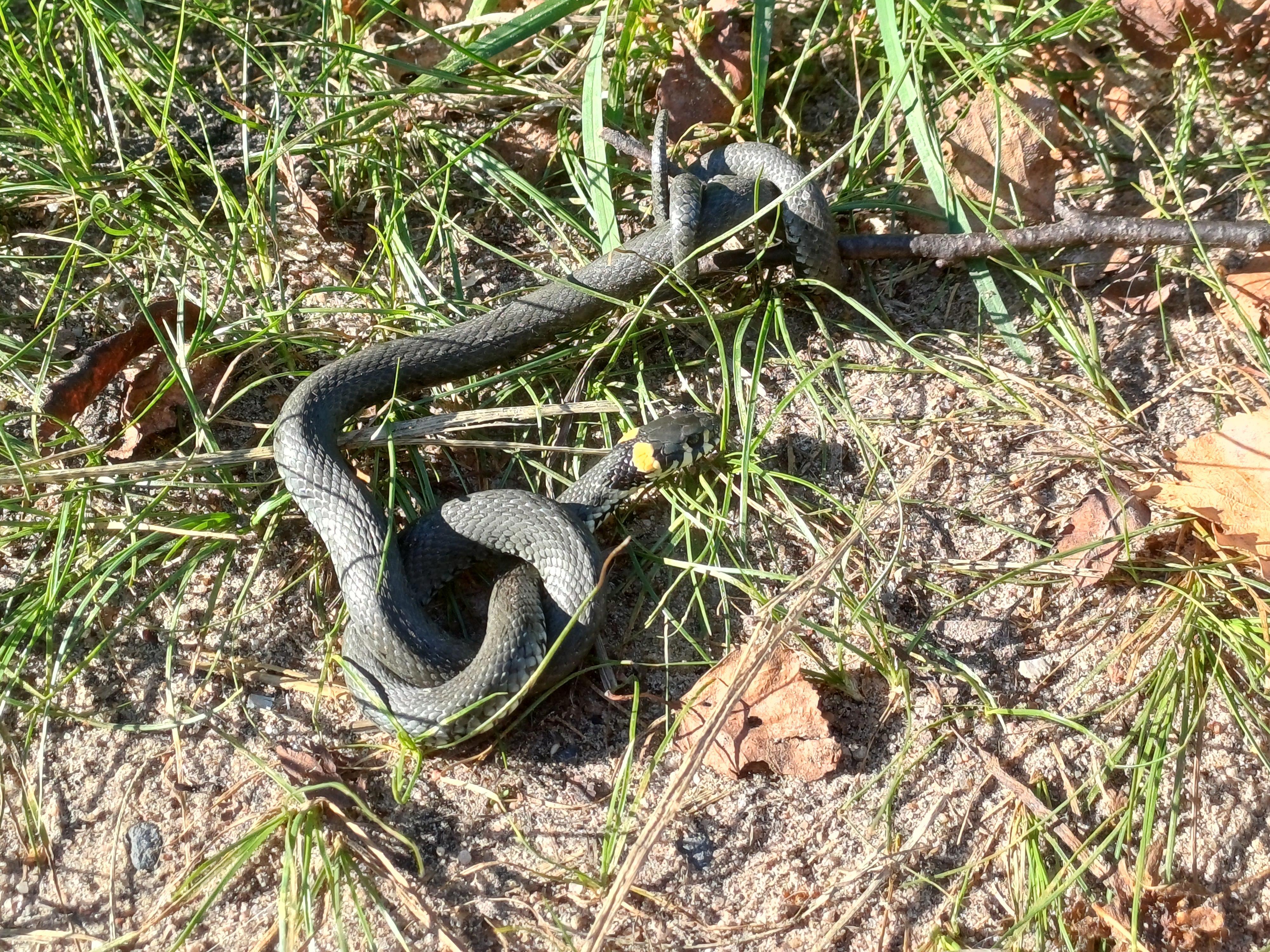 А это Шнурок. Неосторожно загорал прямо посреди дороги в Тригорском и был аккуратно перенесен на обочину: