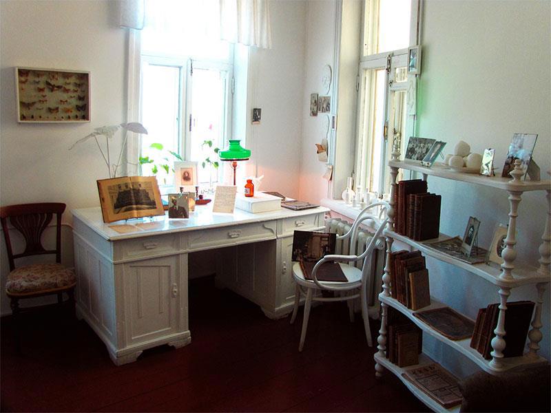 Возникает ощущение,что сидел за этим столом Михаил Афанасьевич всего минуту назад – до того точно картина перед глазами совпадает с фотокарточкой. Обстановка комнаты повторена сотрудниками музея вплоть до мелочей – кажется, что не было этой сотни лет после щелчка Николкиной фотокамеры.