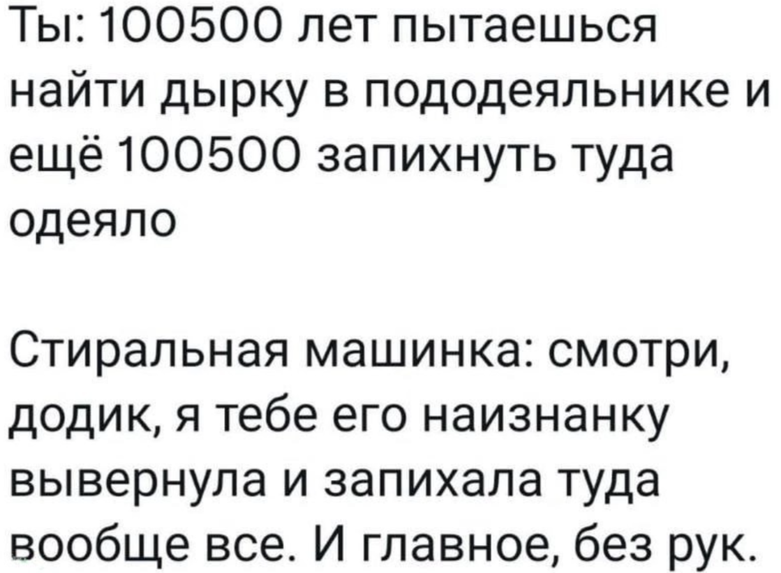 Автор: DaemonПриходит осень, пора доставать пододеяльники. И пора пододеяльникам доставать нас. Знаете, раньше были старые пододеяльники удобные, а новые совсем другие. Так что я решил взять старый добрый пододеяльник, постирать его и... все белье в машинке магическим образом оказалось внутри пододеяльника!