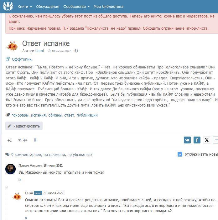 Беседовал с русскоязычной писакой живущей в Испании в коментах к её книге. И внезапно она меня в Ч.С. занесла. Но я-то её не занёс! И решил ответить ей на своей странице: