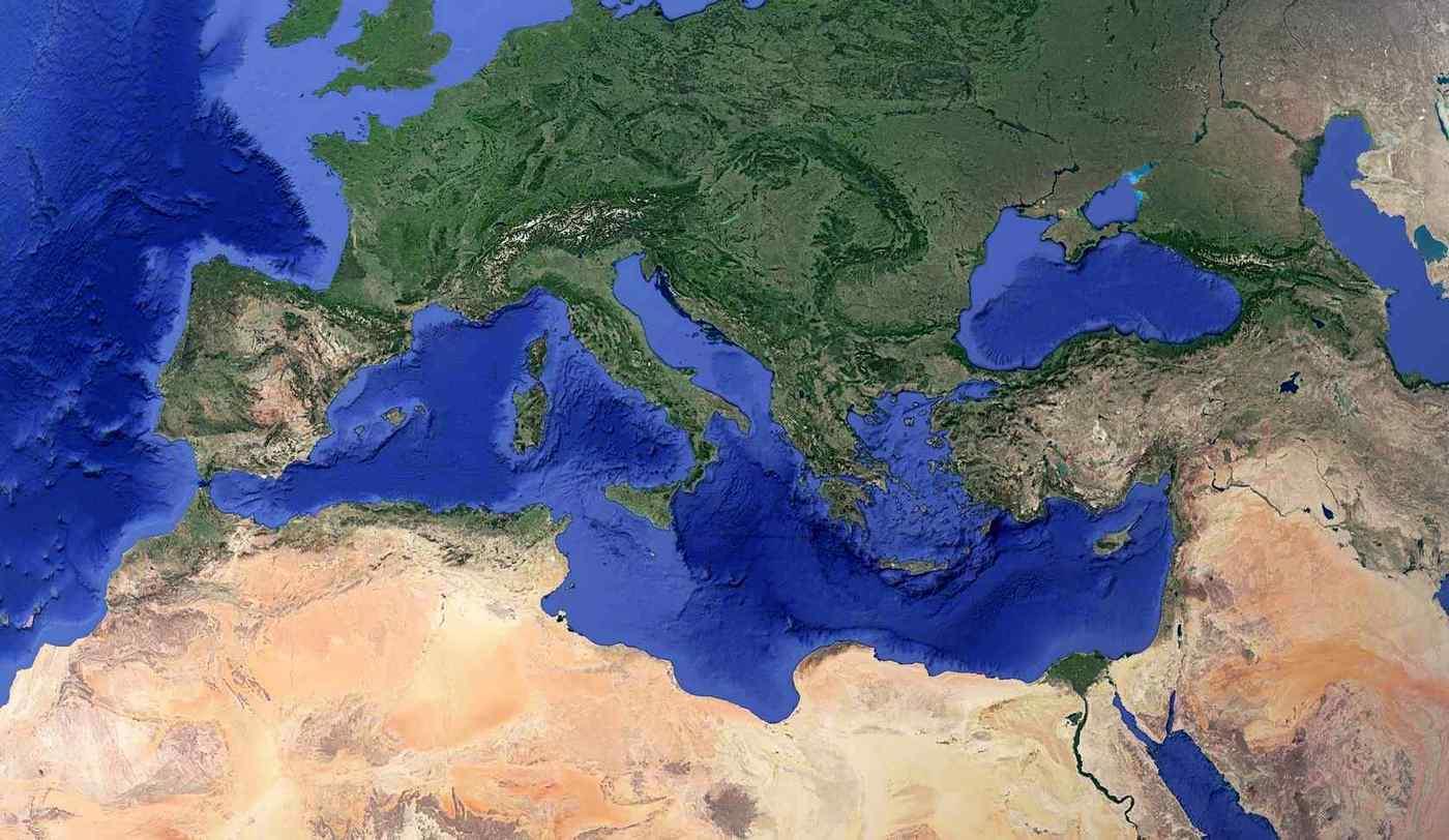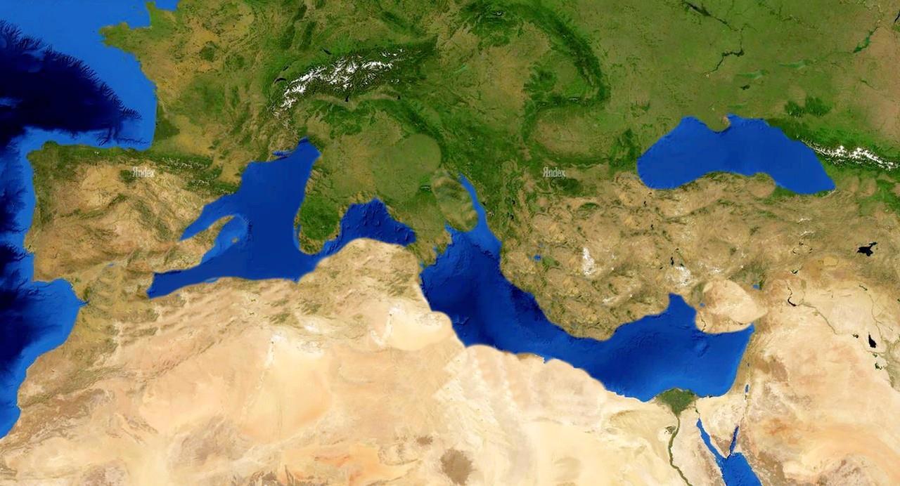 А ещё я с опаской отношусь к «источникам», которые «наука» история то признаёт, то не признаёт в зависимости от политических установок. Вот давайте ещё раз посмотрим на эту самую Африканскую плиту с трещиной… хотя шут с ней, с трещиной. Глянем на её северную часть, которая проходит прям по Средиземному морю, берега которого сплошь утыкано следами «древних цивилизаций» придуманных историками по заказу «уважаемых людей». Место и вправду интересное и геологически тоже. Для начала посмотрим на современную карту этого моря с окрестностями: