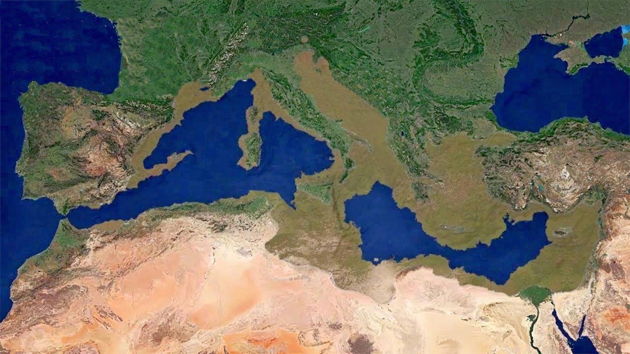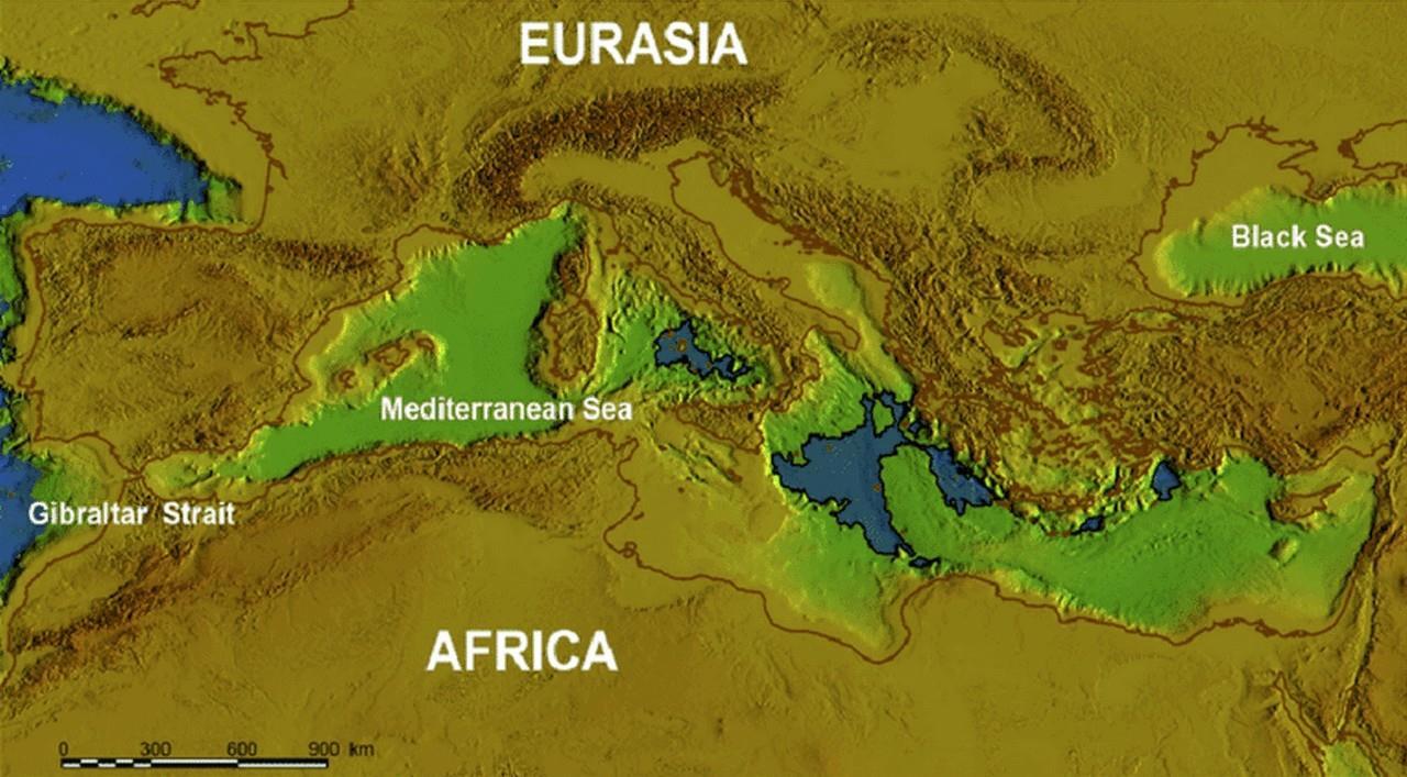 Ладно… идём дальше. Совсем недавно полез научный люд на дно этого самого Средиземного моря. Зачем, почему – не тот вопрос. Главное, что полез и обнаружил на глубине 300 метров вглубь дна водоёма хороший такой слой… гальки. Мало того, прям там же обнаружились остатки всякой мелкой флоры с фауной, которые заявили, что жили и здравствовали они кто в солёной, а кто и в пресной воде. То есть подтвердились старые подозрения, что Средиземное море тоже было не всегда. Оно появилось в результате прорыва воды из Атлантики. А до того имел место быть так называемый «Мессинский кризис» согласно которому воды в том Средиземном море было воробью по колено и только в самой серёдке. Примерно, как на вот этой картинке: