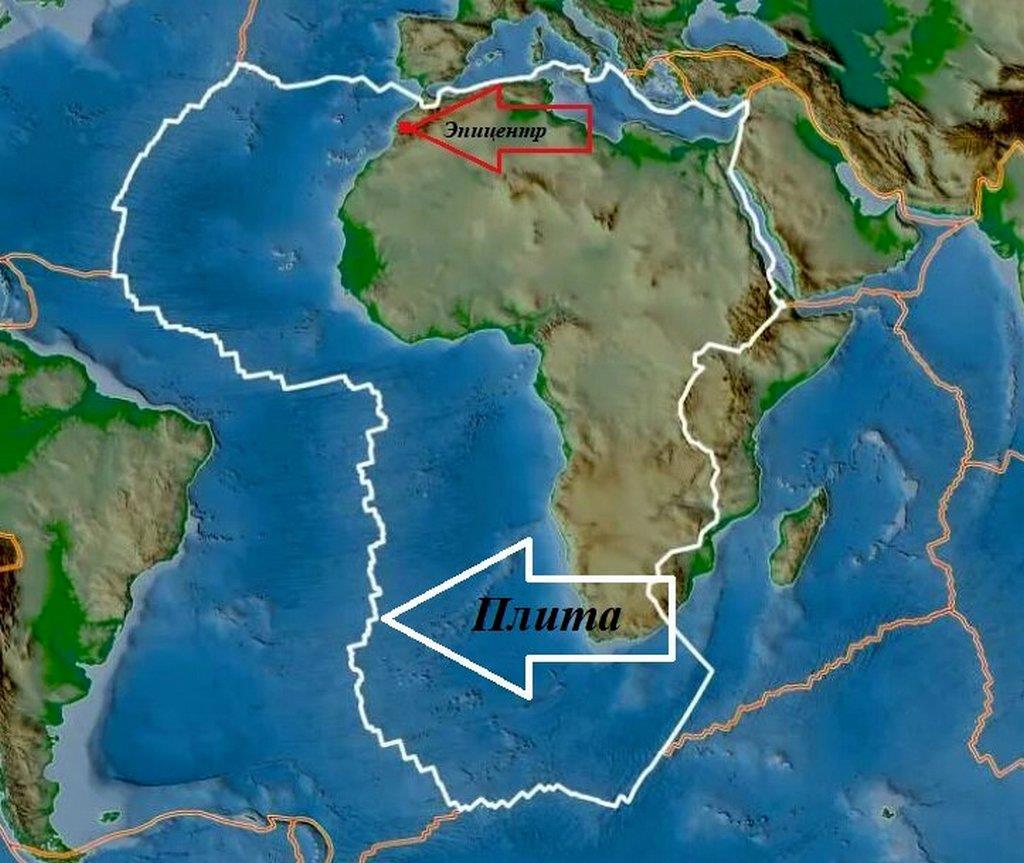 Вот! Задержимся возле Африки – она сейчас немного «в моде» в СМИ. Говорят, что «африканская плита» имеет трещину и плывёт примерно вот в эту сторону: