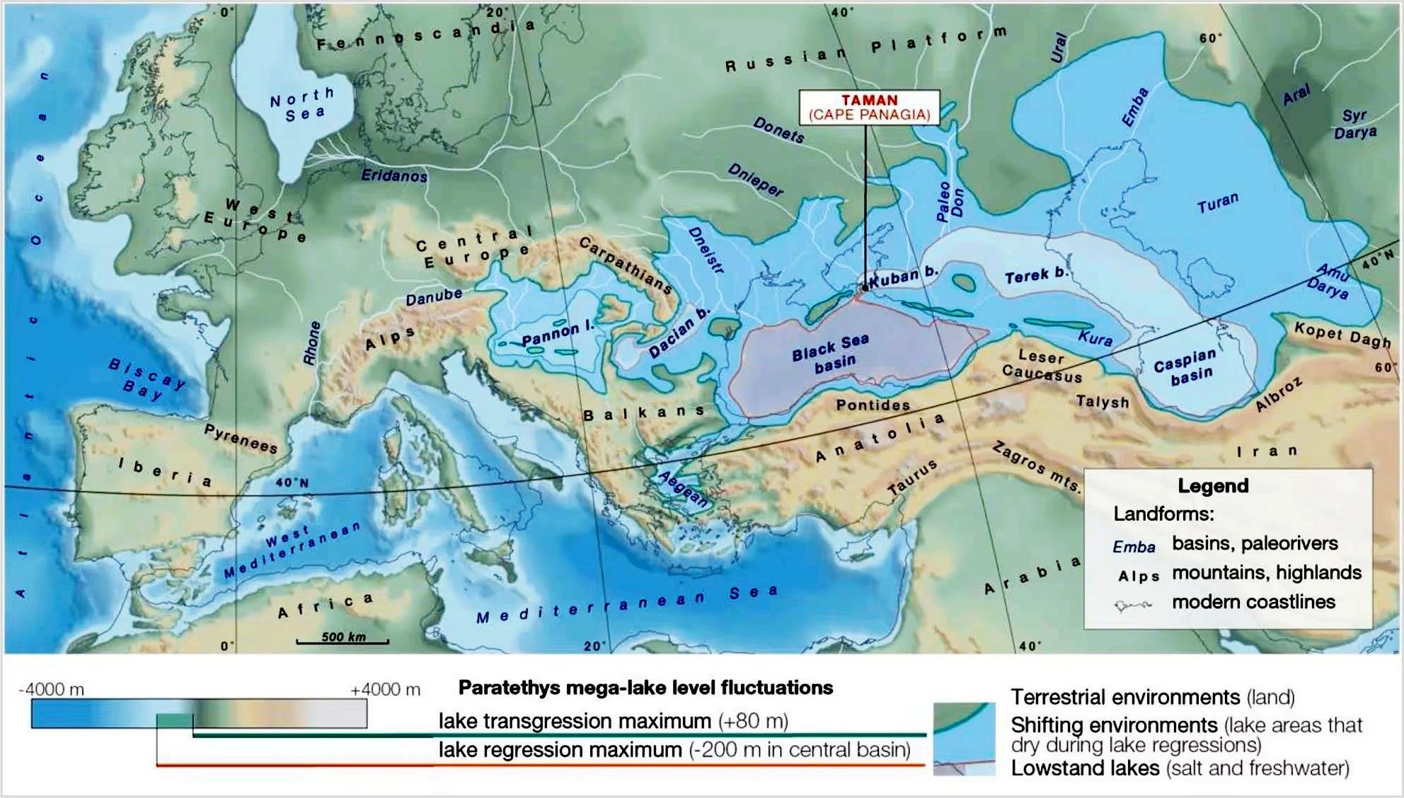 Однако наука не останавливается и рисует вариант с явным избытком воды. Здесь охвачено оказывается не только Средиземное и Чёрное моря, но и Каспий. Смотрите: