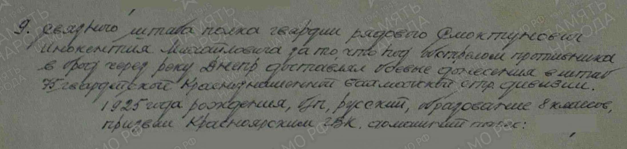 Попал он в самое пекло - на Курскую дугу. Свезло, выжил, но потом их 75-ю гвардейскую дивизию перебросили на форсирование Днепра. Из огня да в полымя, да. Гвардии рядовому Смоктуновичу за Днепр дали медаль "За отвагу". Вот представление: