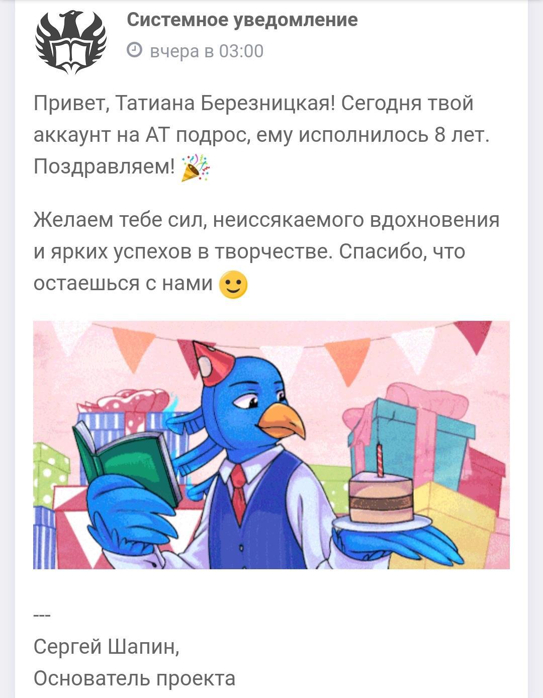 Автор: Татиана БерезницкаяКаждый год я обычно об этом благополучно забываю. И вспоминаю только когда натыкаюсь на чужие блоги. А в этот раз так получилось, что зашла на АТ впервые за несколько дней и оба-на... а у моего аккаунта днюшка была вчера оказывается. И я почти что не опоздала. И даже поздравление получила. Приятно таки .