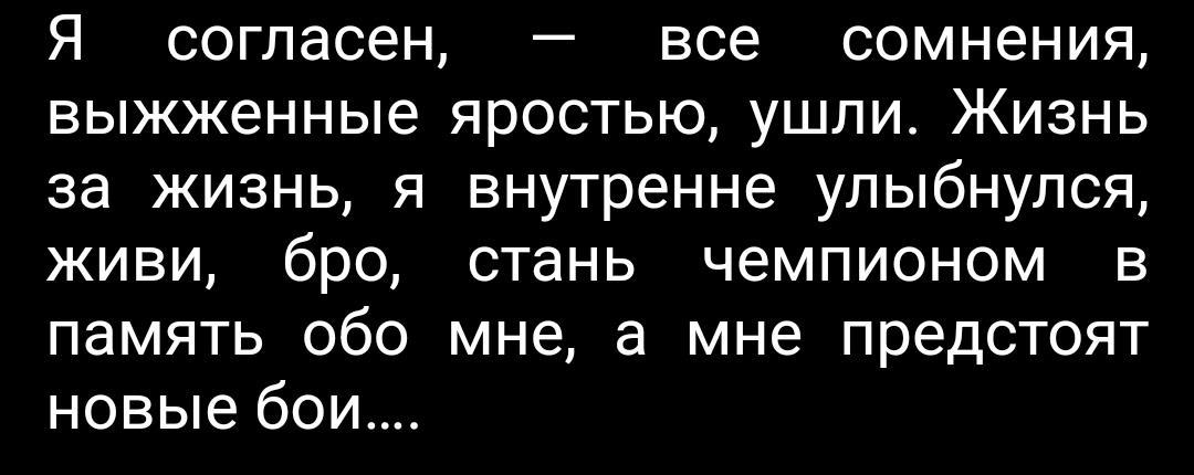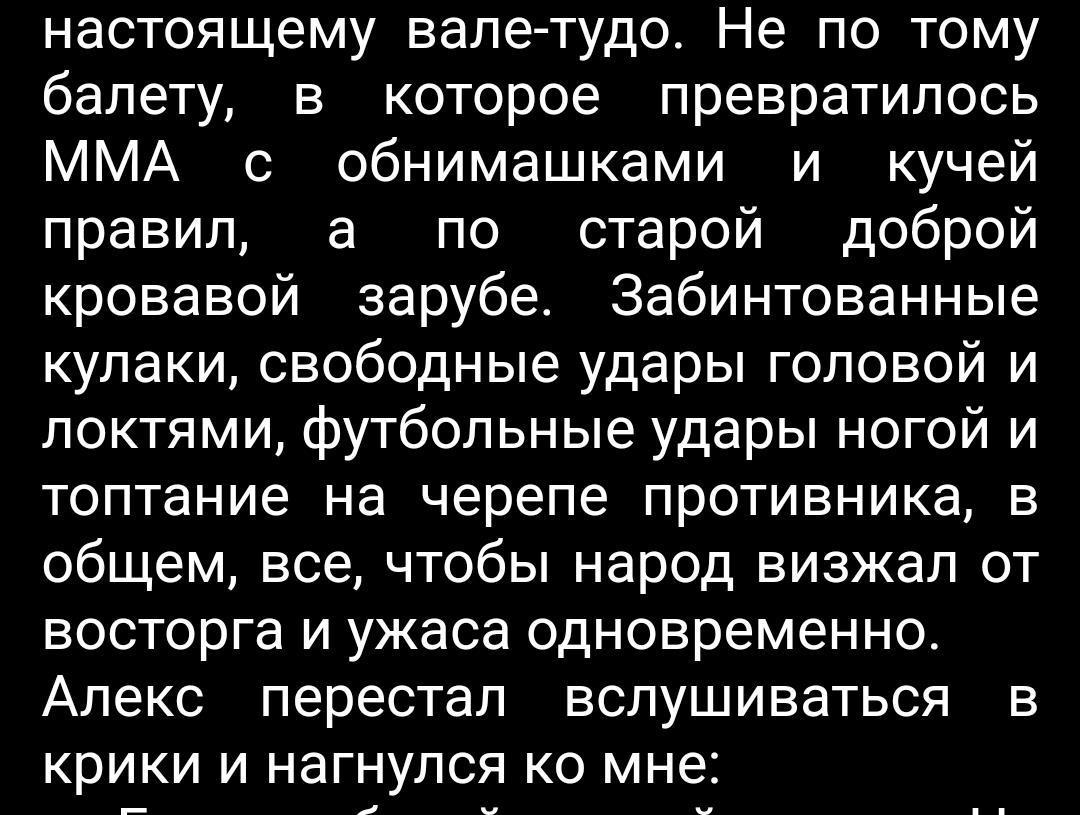 матёрый автор сходу опустил такой важный момент, как мотивация. С чего бы этот гений восьмиугольника дерётся за копейки насмерть, вместо того, что бы ломать Макгрегора и Хабиба в балете. То ли герой этакий Портос, тупой адреналиновый маньяк, который дерётся потому что дерётся, то ли просто маньяк, которому важна возможность выбить оппоненту глаза из черепа ударом по затылку. Но бог с ним, потом будут наверное флешбэкт про несчастные обстоятельства.
