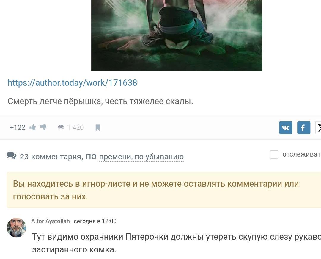 Ну казалось бы забыть и пойти дальше, но мне немедленно напихали в панамку, а Алексей Широков даже ответил (хз правда что его тригернуло, говорит мол тупость). Слово за слово дошл и до аргумента "тыж не читал", ну я действительно не читал. И исправляя этот косяк пошел по ссылке, кстати вот она https://author.today/work/171638