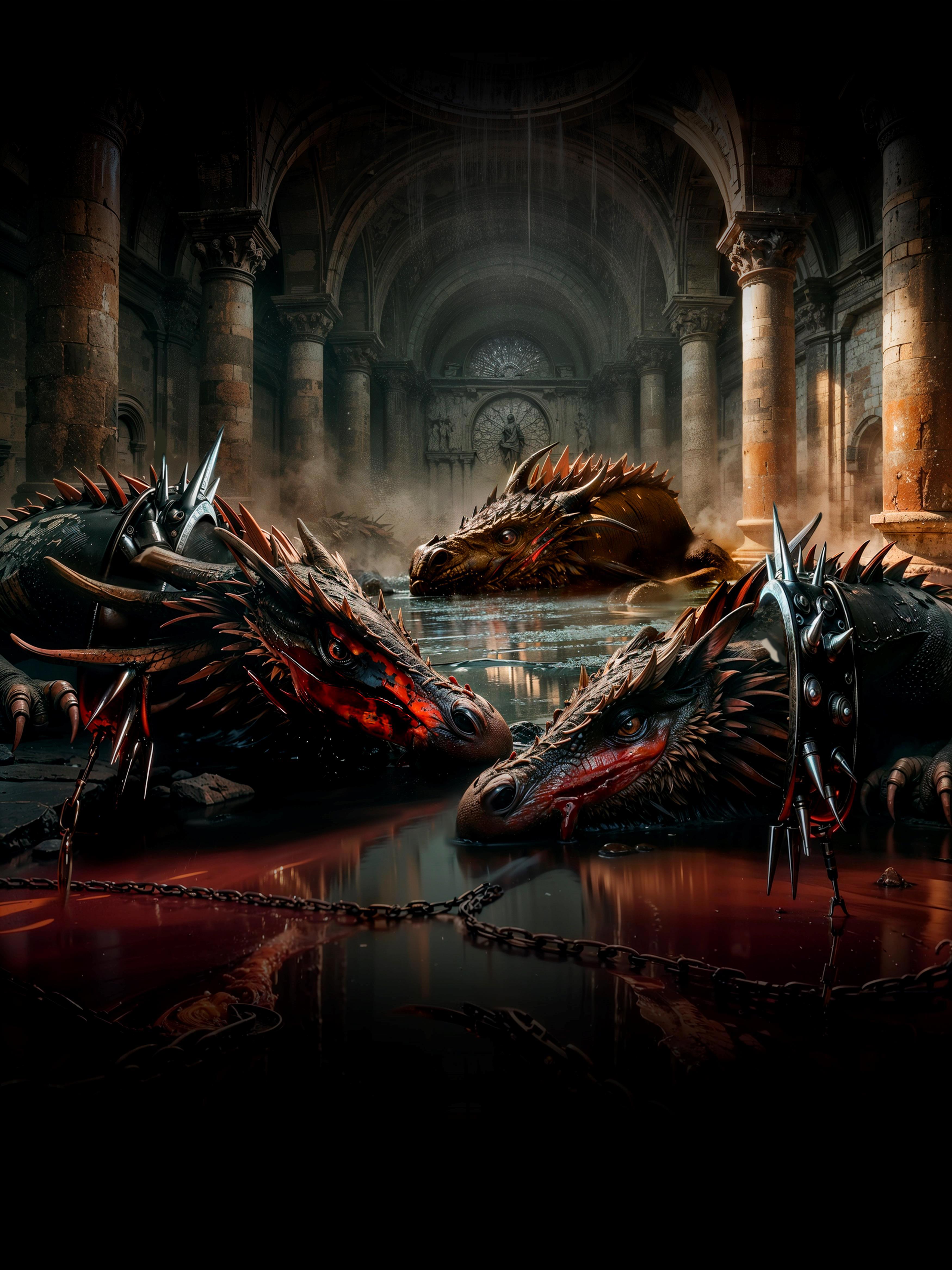 На широком краю бассейна лежали головы драконов — две чёрные, тусклые и светло-коричневая с зеленью, один взгляд на них заставил содрогнуться. Белая оглушительно взвыла. Намордники и широкие толстые конусообразные ошейники из чёрного металла крепились короткими массивными цепями к кольцам, на две трети впаянными в пол между плитами. Драконы не двигались, не могли. Тела скрывала вода, тёмная и мутная, как и их широко раскрытые глаза. У всех спилены рога, роговые шипы и наросты, изрезаны губы и ноздри. Они слепо таращились, но чутко улавливали каждый звук, пытались повернуть головы, глубоко и возбуждённо вдыхали запахи, отчего поверхность воды заколыхалась.
