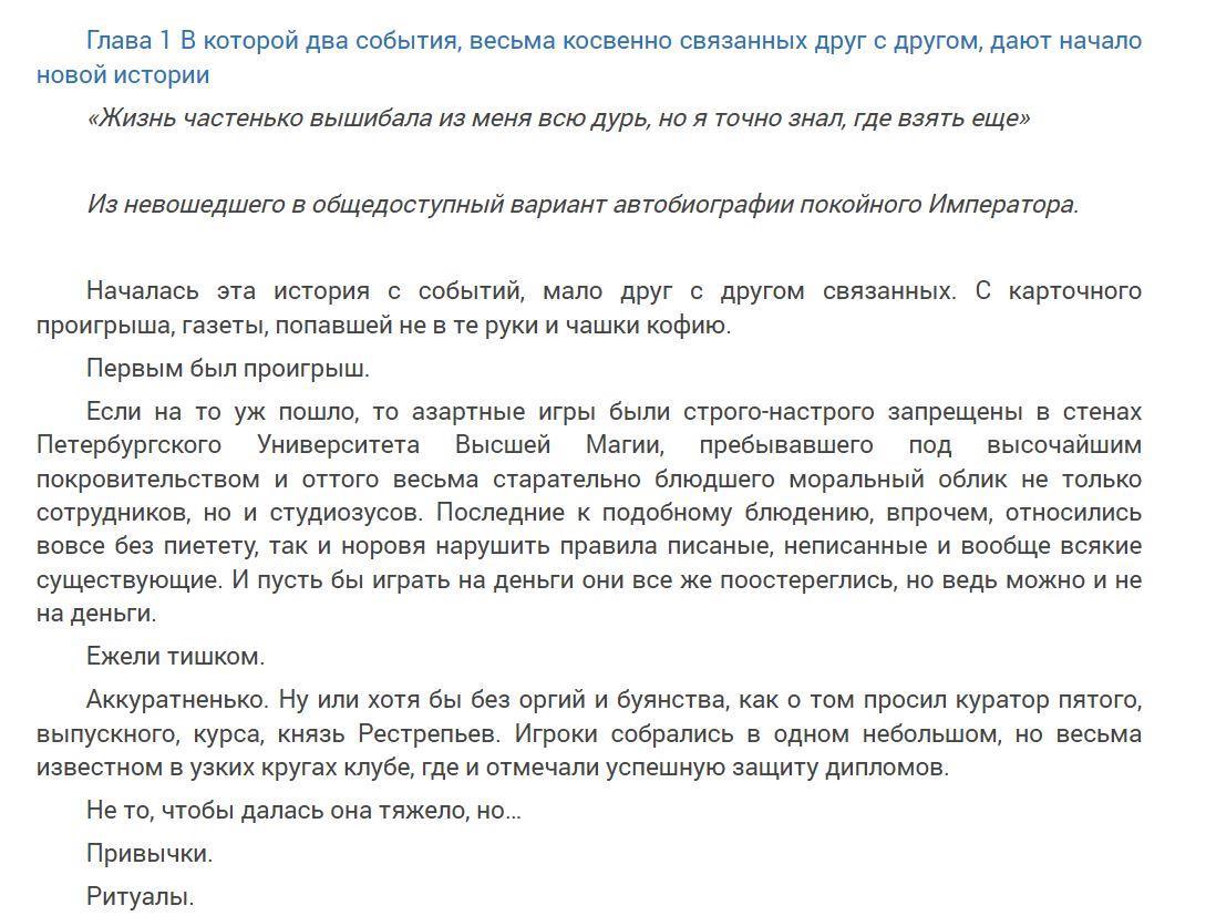 Какая-то цитата из неизвестно чего. Какие-то рассуждения об азартных играх в университете... Никакой динамики. Да еще стилизация под язык 19 века со всякими там "блюдшего", "студиозусов" и так далее. Но при этом АР автора - 2 с лишним лимона. То есть вполне достойно даже на фоне ТОПов АТ.