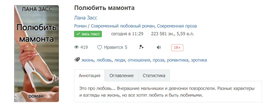 Автор: Лана ЗассЯ, вообще-то, любитель малой прозы. И писать, и читать. Но ... соблазнилась написать свой первый роман. Даже не догадалась выкладывать небольшими частями. А сразу - ба-бах!