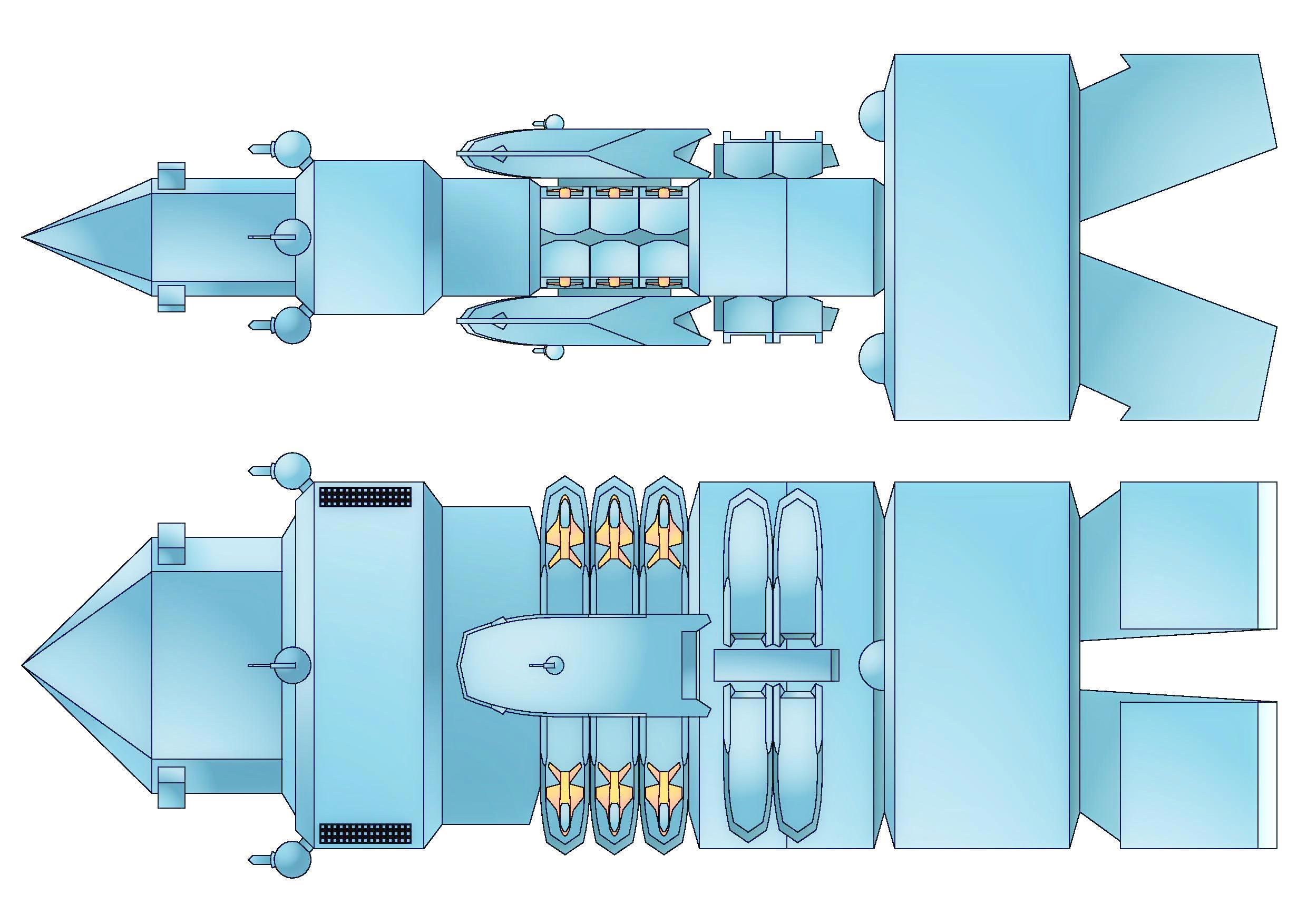 Автор: Евгений КрасНачало процесса и его обоснование можно посмотреть в моей маленькой заметочке https://author.today/post/40645 . Процесс имеется в виду написательства, писанины... короче того самого, чем большинство местных активно и даже иногда весьма успешно занимается (я не из этого муравейника). Для тех, кому лень кнопку нажимать, поясню - я там про "проектирование" корабля для собственного написания говорил. Так как я из тех ещё времён, то имею привычку доводить дело до какого никакого логического завершения, даже если мне это нафиг не нужно. Да... привычку имею, но очень капризную. Поэтому она меня иногда покидает, а может побеждает другая привычка - ЛЕНЬ. Так и здесь случилось. Хотел, понимаешь, нарисовать для тех, кто здесь читает то, что я понаписал, объёмную картинку этого корабля из моей книжки, но тут одолела она самая - ЛЕНЬ. Поэтому я, зевнув, просто раскрасил плоскую (Автокадовскую) картинку. Вот что получилось при трансформации в жепегешный формат: