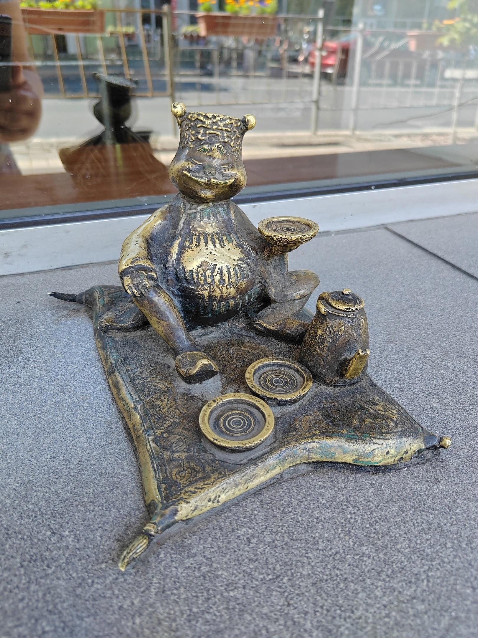 От грустного молодого человека переместимся опять в центр. Там, но окне кафе "Трактир купца Сарибана" (был такой караимский купец в Симферополе до революции, говорят, что именно в этом доме и был открыт им трактир для жителей и гостей города, где можно было не только покушать, но и обсудить дела, и заключить выгодную сделку) сидит пьющий чай и приглашающий всех в трактир красавец-купец. Очень часто в его чашечках появляются монетки. Не знаю для чего их кладут, но лежат они в них регулярно.