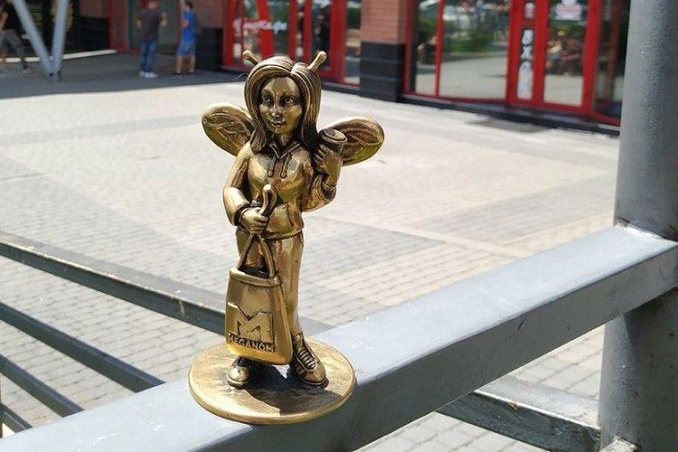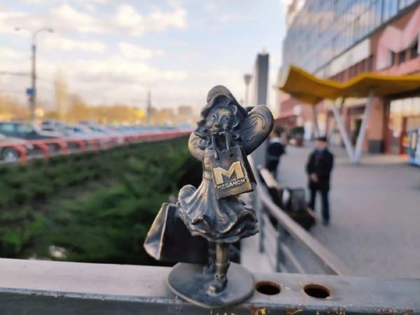 Сегодня мы покажем нашу дорогую Модницу, которая стоит на перилах мостика возле торгового центра "Меганом". Этой пчёлке досталось не меньше чем Силачу. Но если Силача просто в итоге перенесли в самый центр города, чтобы он всё время был на виду и это решило вопрос с его похищениями, то Модницу после очередного похищения сделали совершенно новую.