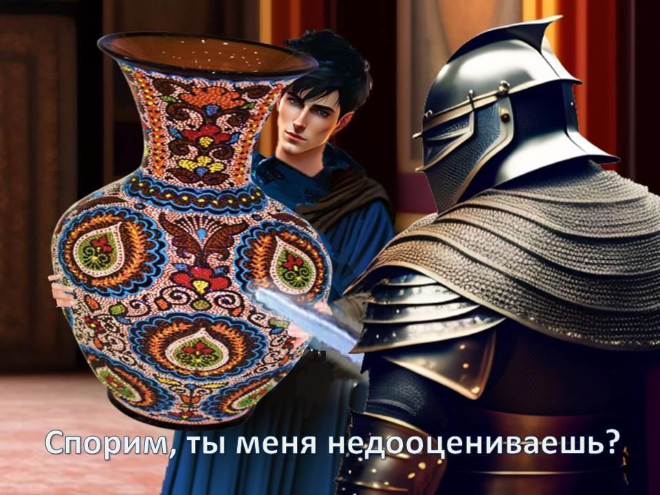 Один стражник уже спешил ко мне с мечом наготове. Я выставил вперёд свою ношу, послышался звонкий удар, который сшиб противника с ног, и тогда я обрушил вазу ему на шлем.
