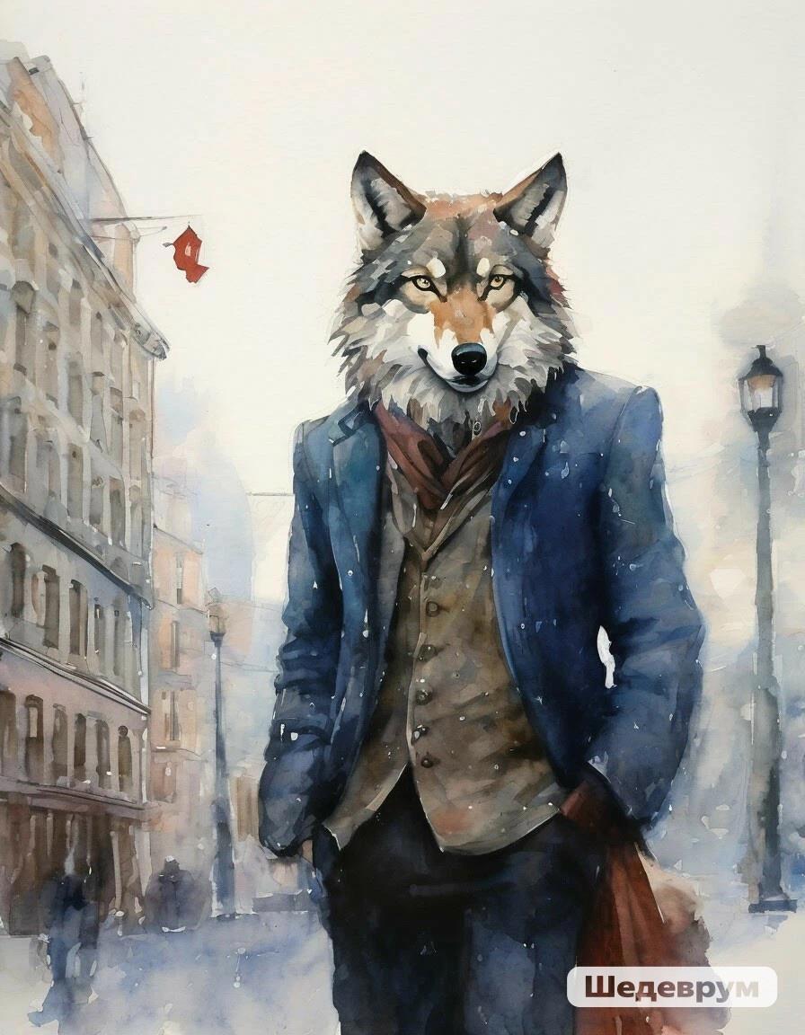 И посмотрите какую прелесть мне выдал Шедеврум на запрос "Волк в Санкт-Петербурге", акварель"