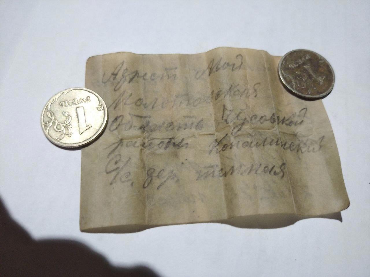 В записке боец написал свой адрес: Молотовская (сейчас Пермская) область, Чусовский район, Калалинский (Копаленский) сельский совет, деревня Темная, жена Черемных Антонина Яковлевна."