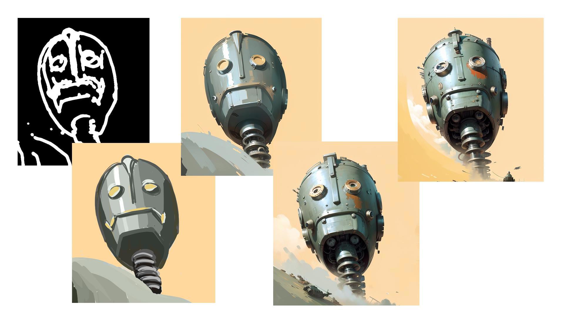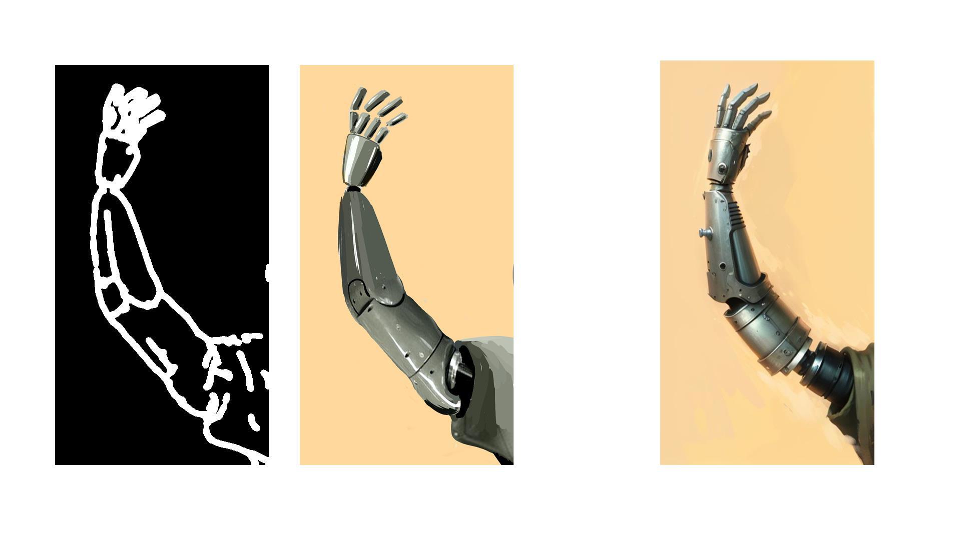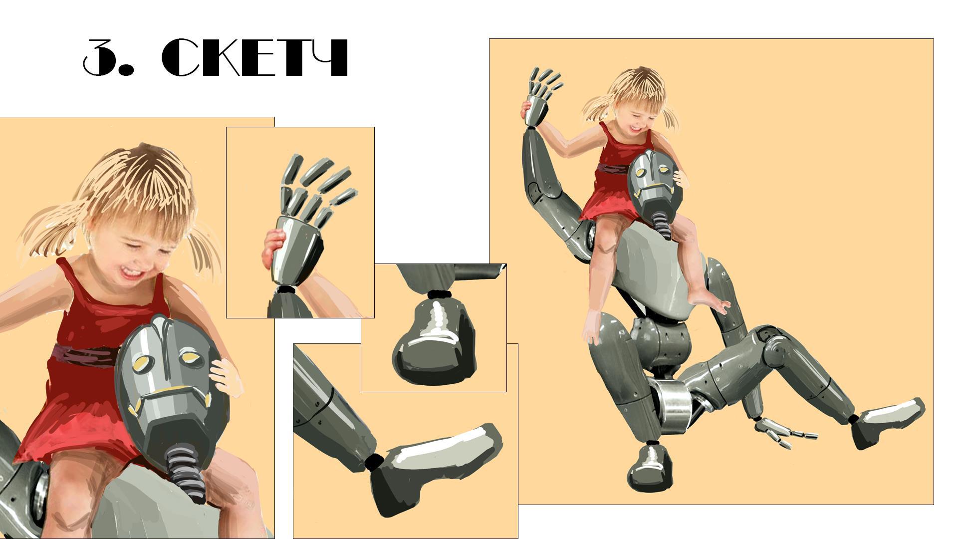 Дальше создаем макет, "эскиз". Можно и не такой подробный, вы приглядитесь - с детальностью там соседствует скетчевая простота, и она отработалась не менее великолепно. Половина робота набросана мазками от руки, без фотографической техногенности.