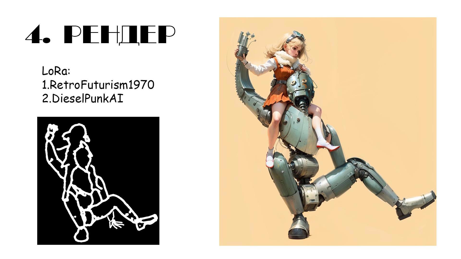 Сейчас будет смешное. Сеть не волшебная (волшебные мы), и указанные спецмодели для ретрофутуризма и дизельпанка сработали очень по-разному. Дизельпанк отразился на ура. А ретрофутуризм нещадно прошелся по девочке. Эта микродама мне не подходит, буду генерировать отдельно.