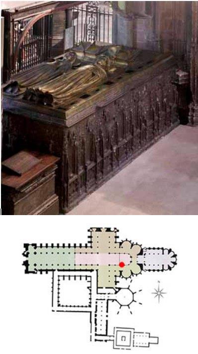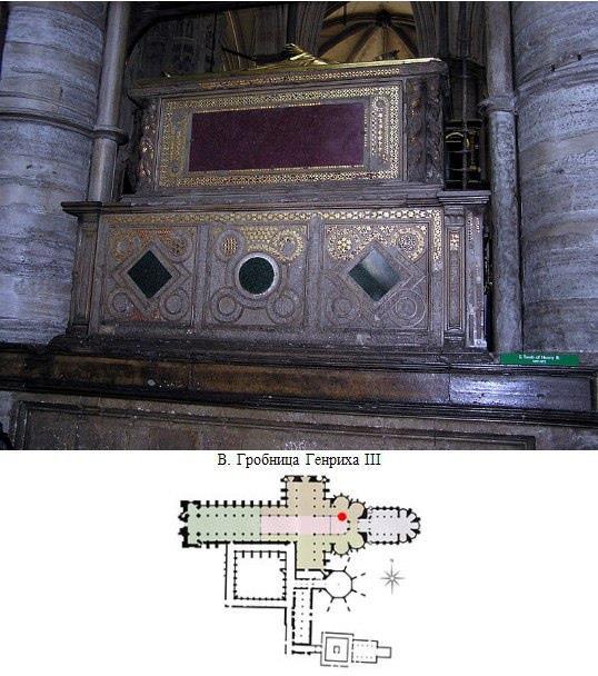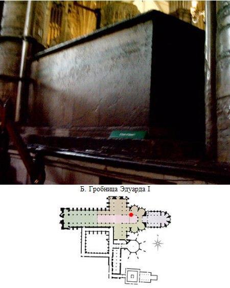 Гробница Эдуарда I. Умер в 1307. Это единственная в капелле гробница без изваяния — на него тогда не хватило денег. Прежде над ней был деревянный полог, но он обрушился, когда на него забрались зеваки, чтобы лучше видеть похороны, происходившие в галерее. В 1774 г. усыпальницу раскрыли — король лежал в мраморном гробу, завернутый в вощеное полотно. На голове его, покрытой багровым шелком, была позолоченная корона, в правой руке — скипетр, в левой — жезл, украшенный эмалевыми дубовыми листьями, с навершием в виде голубя.