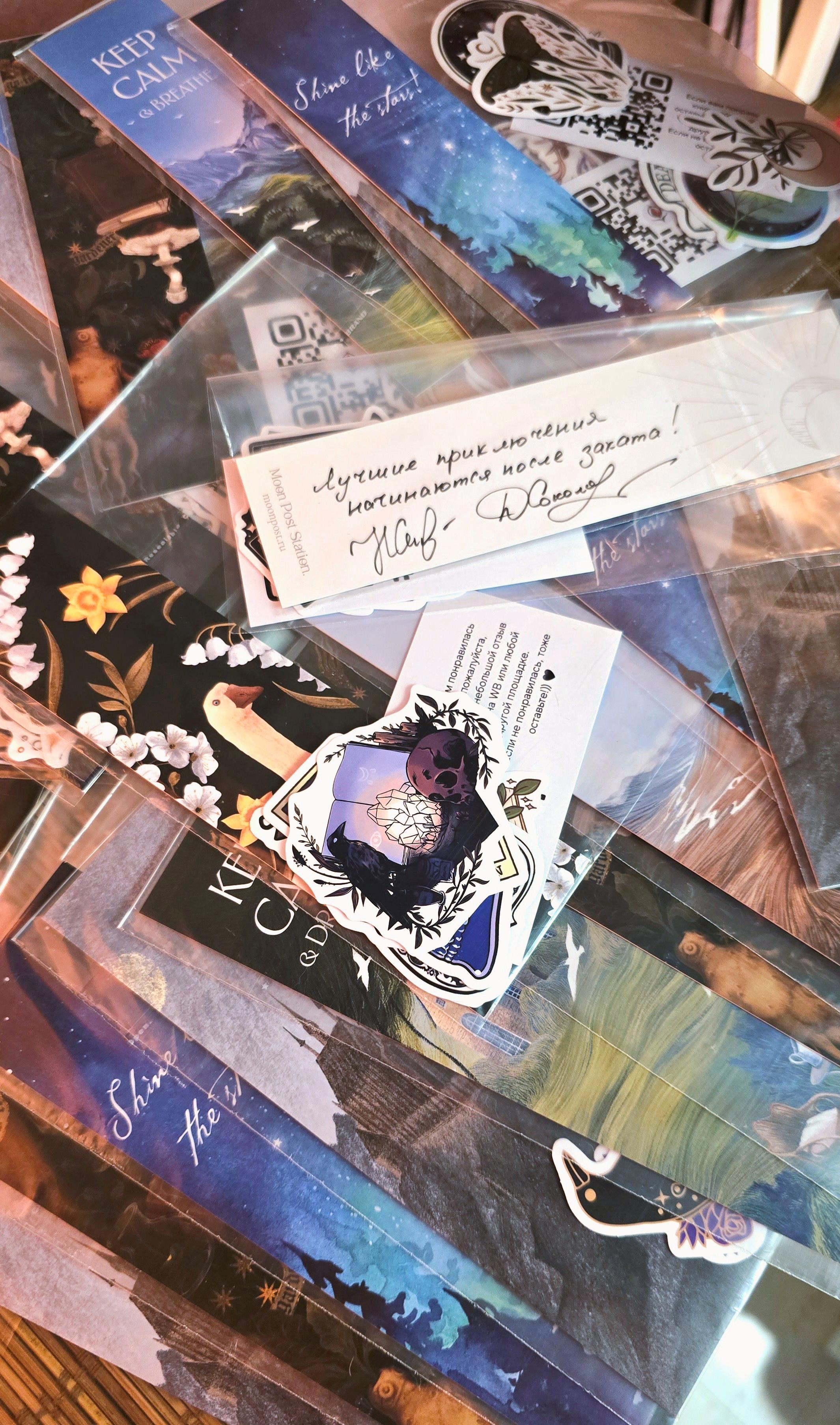 Ещё и на автографы ушло какое-то время: теперь в каждую книгу, кроме тёмно-фэнтезийных наклеечек, вложен сюрприз с нашими каракулями🤭