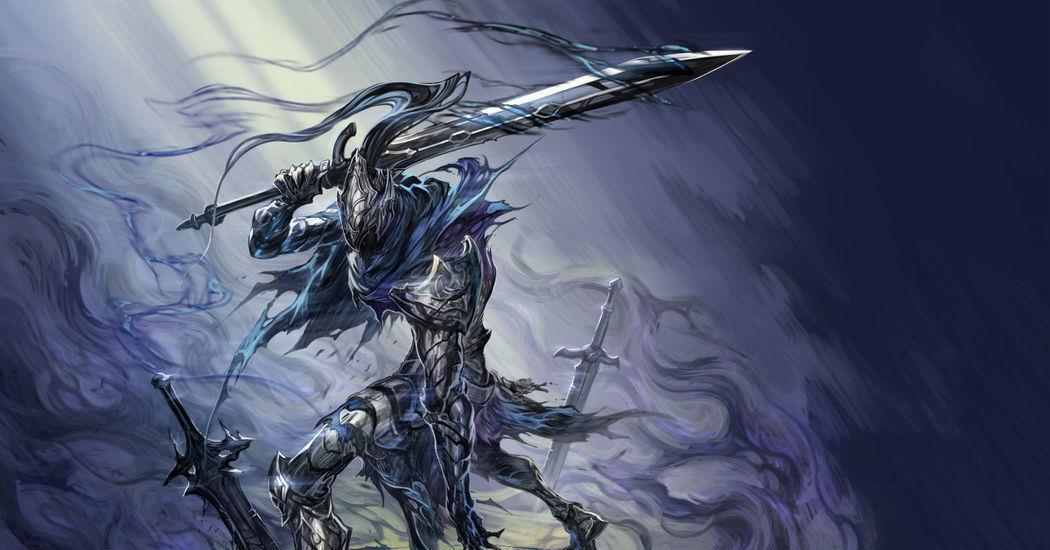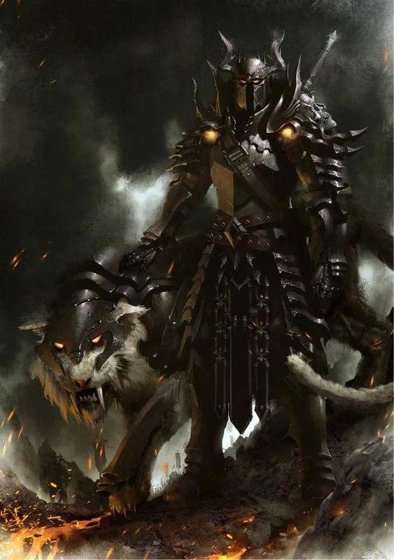 1. Внушительный рыцарь в черном тяжелом латном доспехе, рогатый шлем, двуручный меч за спиной (Так чтобы виднелась лишь рукоять, лезвие с данного ракурса было бы скрыто),