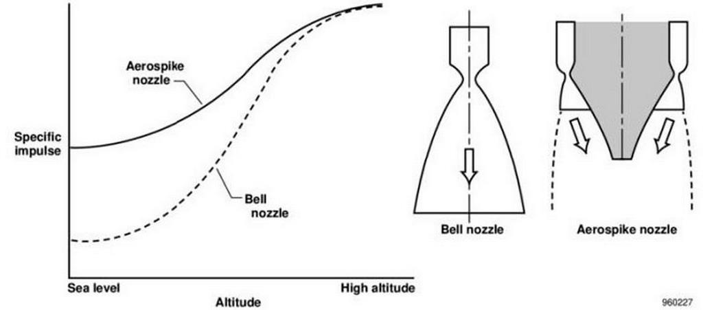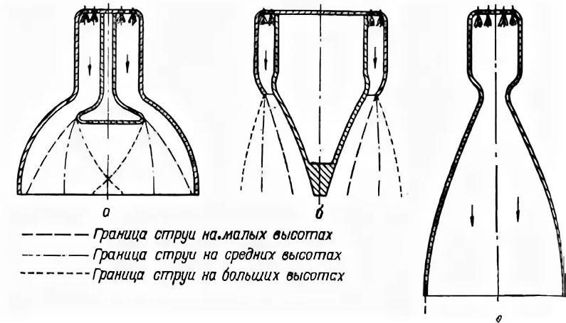 Все работы конечно ведутся секретно, но кое-что просачивается… самое свежее, что просочилось для широкой публики называется «aerospike» по-английски. Ну, а по-русски это «клиновоздушный двигатель». Точнее «клиновоздушный ракетный двигатель» или КВРД. Речь здесь на самом деле не о двигателе, как таковом (Он всё тот же – химический), а о конструкции сопла. Обычное конусное сопло, которое примелькалось публике в фильмах – не единственный вариант. Вот, например, картинка из учебника 60-х годов с тремя основными вариантами сопел жидкостно-реактивных двигателей (ЖРД):