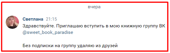 Но здесь же были условия пожёстче. Тебя «приглашают» вступить в книжную группу, а если это не сделаешь, то удалят из друзей: